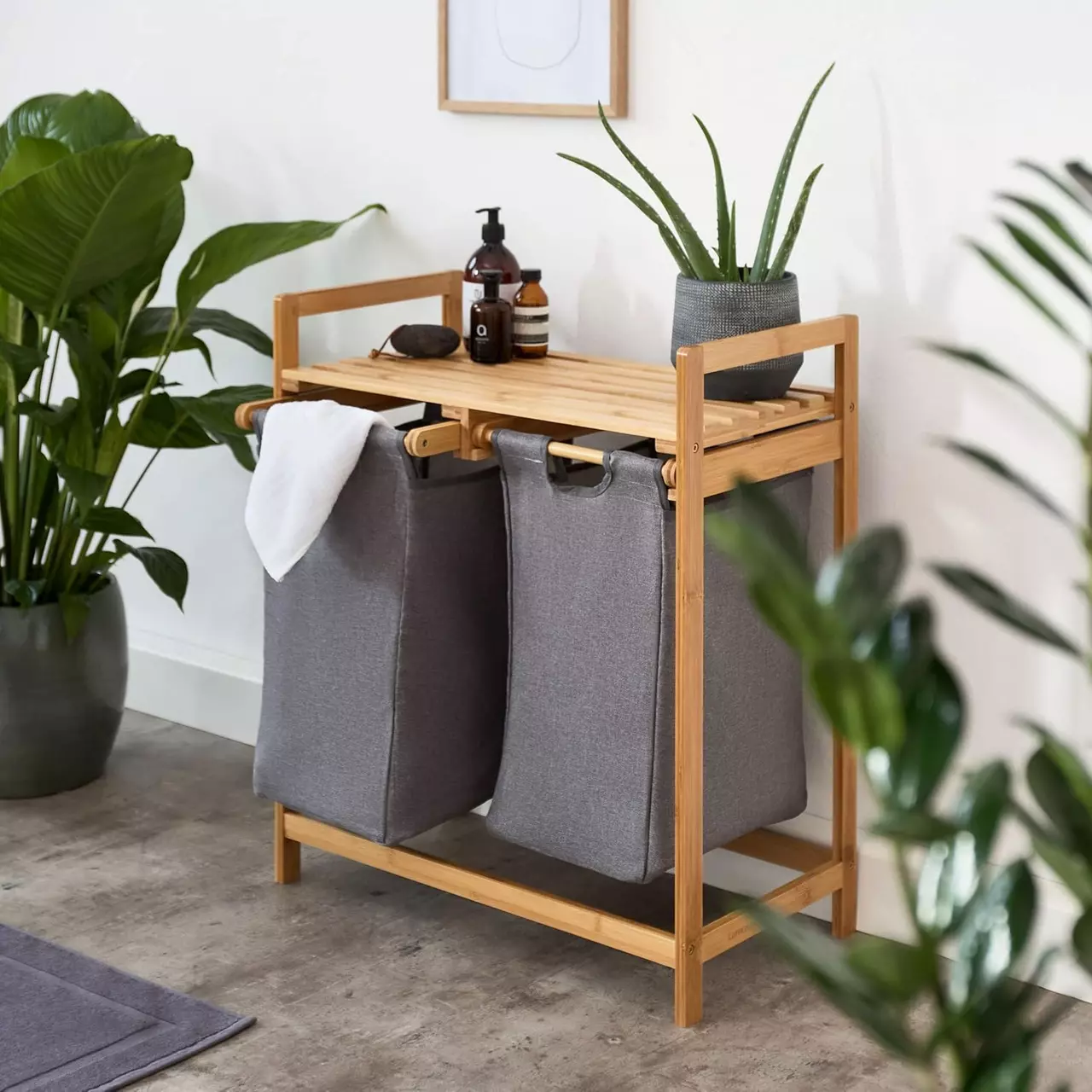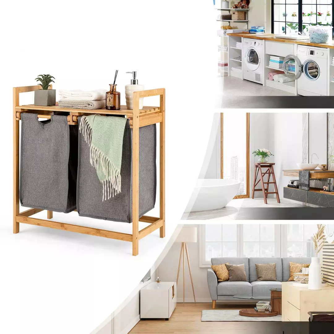 Каркас выполнен из натурального бамбука, устойчивого к влаге и механическим повреждениям. Съемные мешки из прочной ткани оксфорд оснащены застежками-липучками, что делает их удобными в уходе - их легко снять, перенести и постирать при 30 °C. Встроенные направляющие позволяют легко выдвигать мешки для загрузки и выгрузки белья.