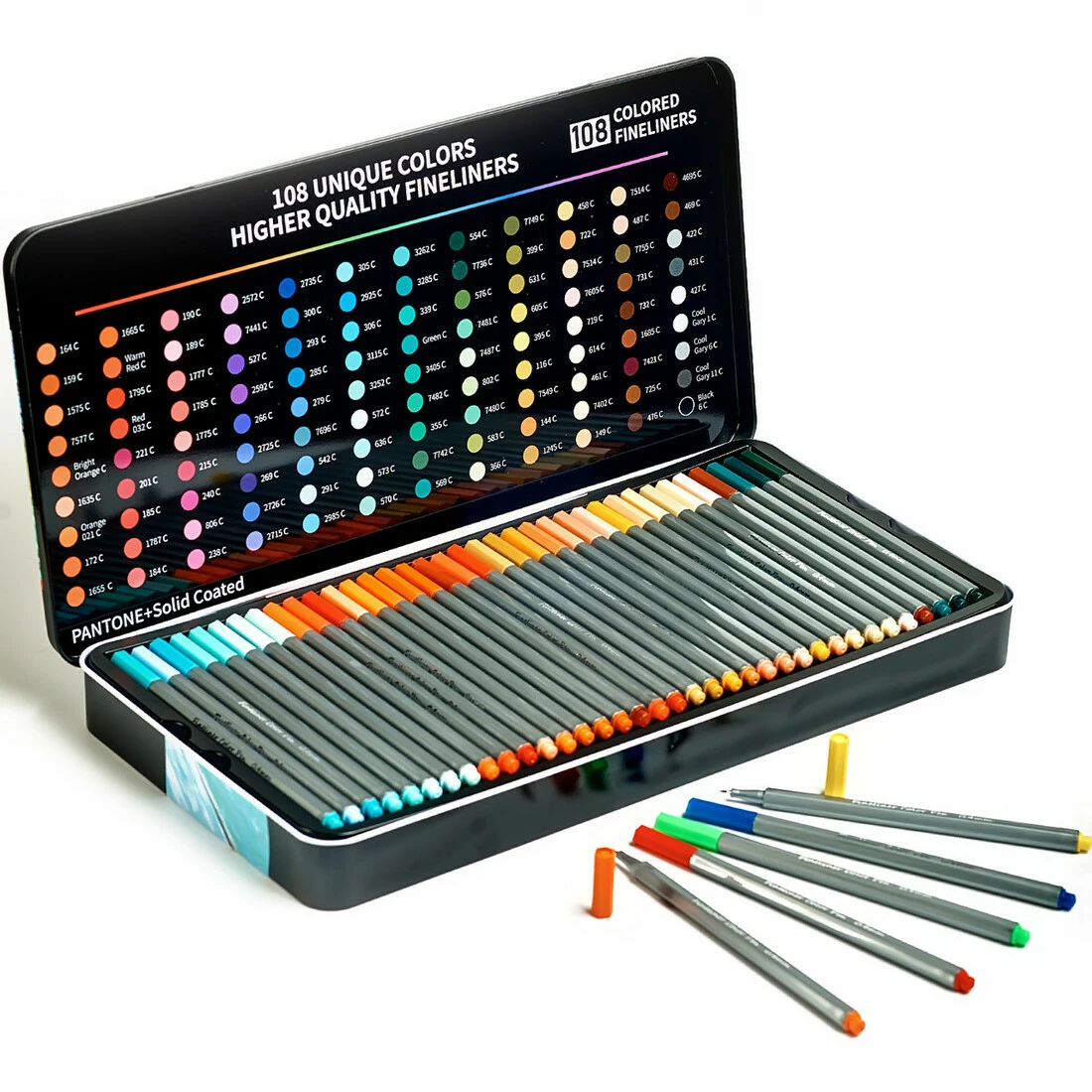 Вы покупаете Большой набор разноцветных линеров в металлическом кейсе Fineliner 102 цветов 0.4 мм и вместе с ними получаете набор качественных лайнеров 9 шт. разного диаметра от 0.05 мм до 0.8 мм и кисточки Brush.