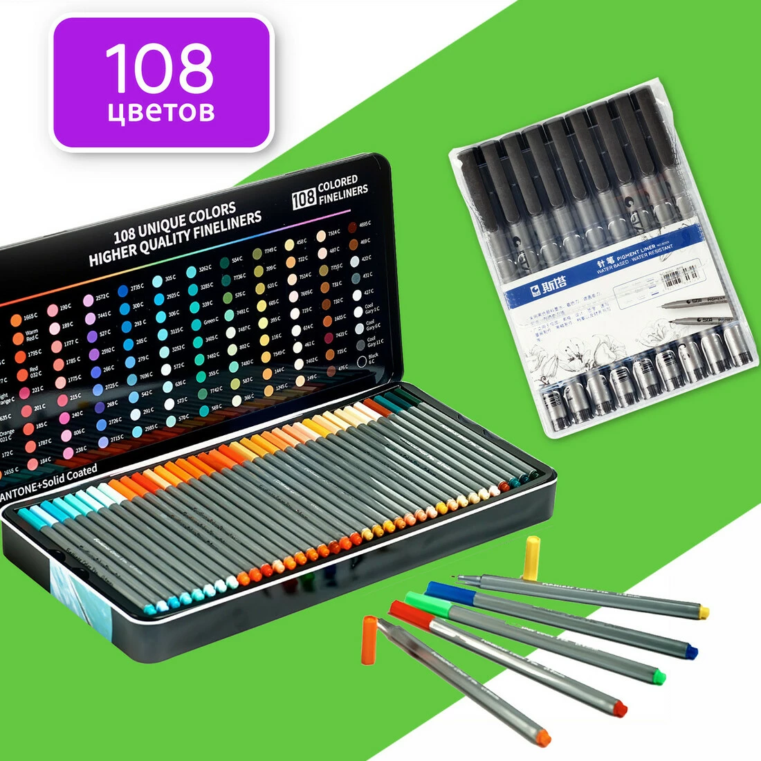 102 цветов 0.4 мм и Набор черных линеров 9 шт