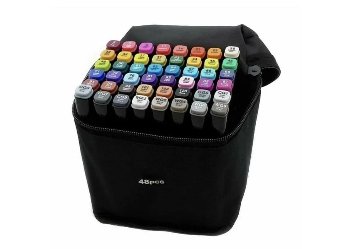 В наборе 48 маркеров разных цветов. Корпус пластиковый, гладкий. Колпачки плотно закрываются. Для удобства распознавания типа пера концы маркеров окрашены разным цветом.