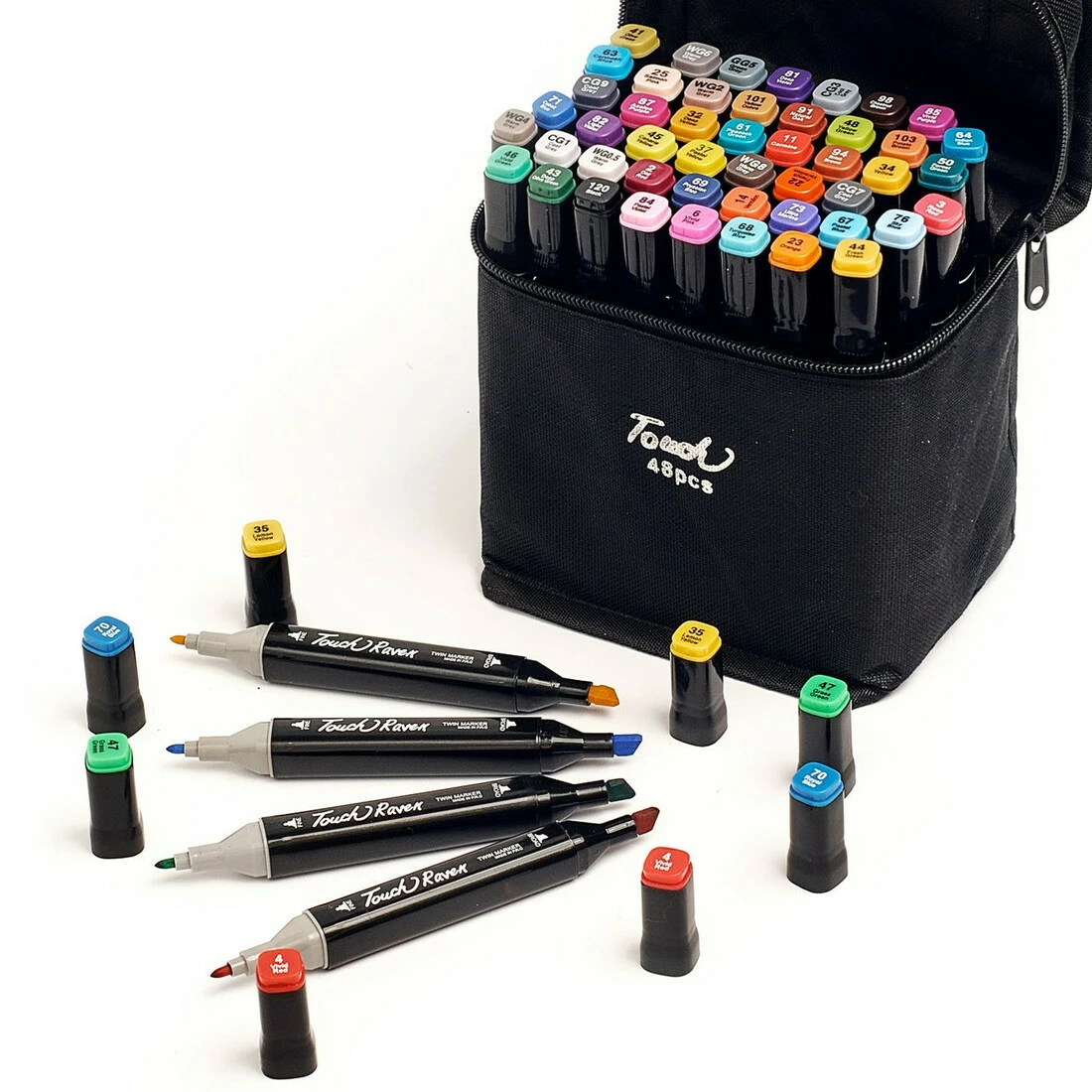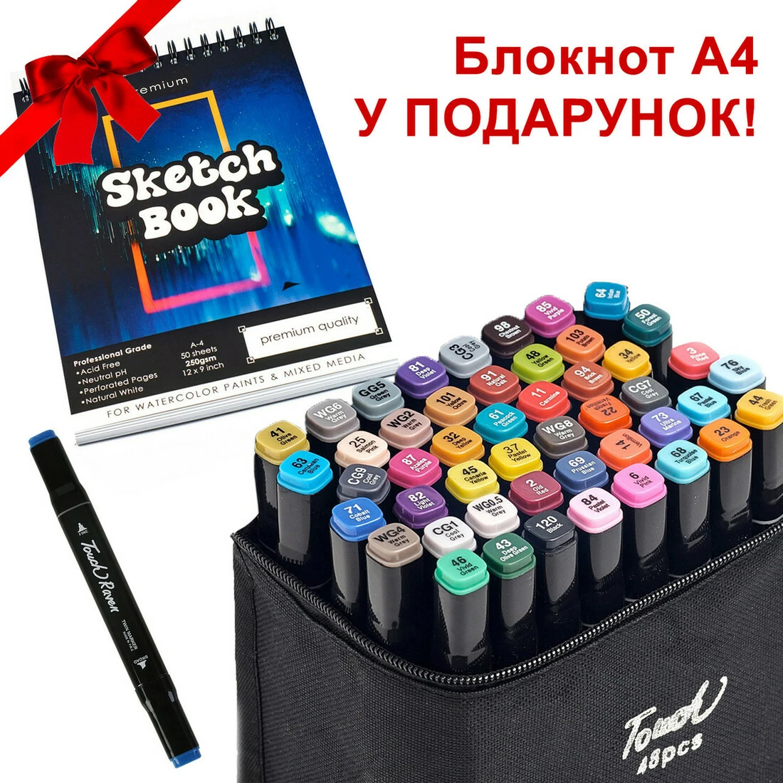 Большой набор скетч маркеров 48 цветов Touch Raven в черном чехле и Блокнот А4 для рисования в подарок!