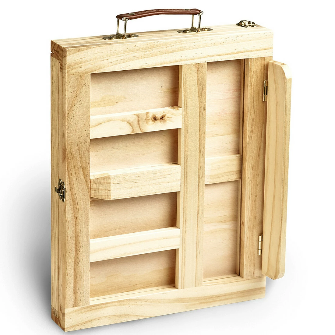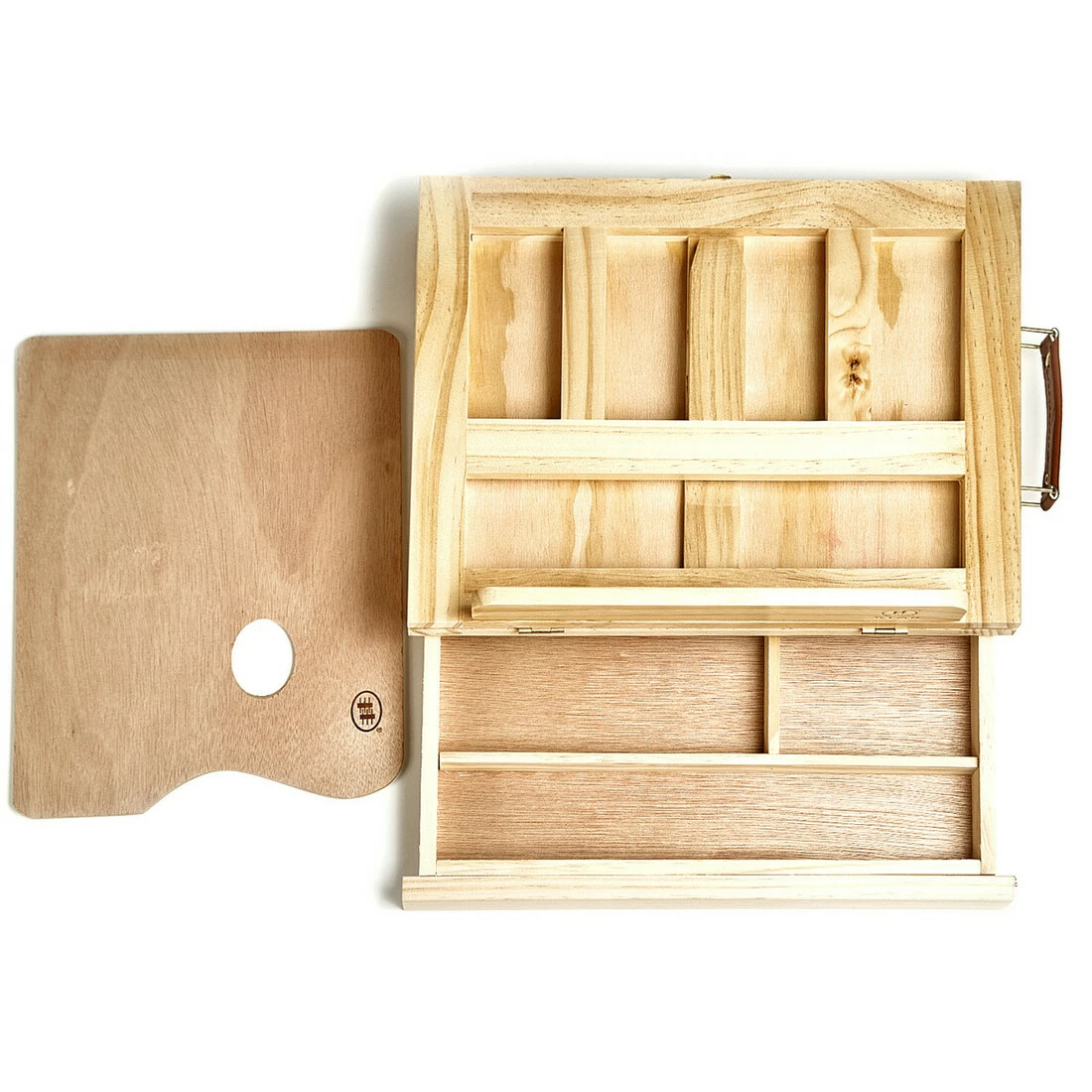 Конструкция деревянного кейса эргономично включает планшет и выдвижной ящик с секциями для художественного инструмента. У планшета подставки ступенчатая регулировка угла наклона на 4 позиции и маленькую полку для опоры работы.
