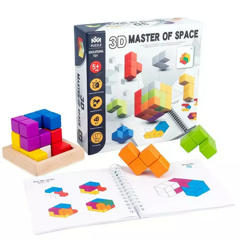 Деревянный конструктор Монтессори куб на 7 элементов и 60 карточек с логическими задачами в цвете