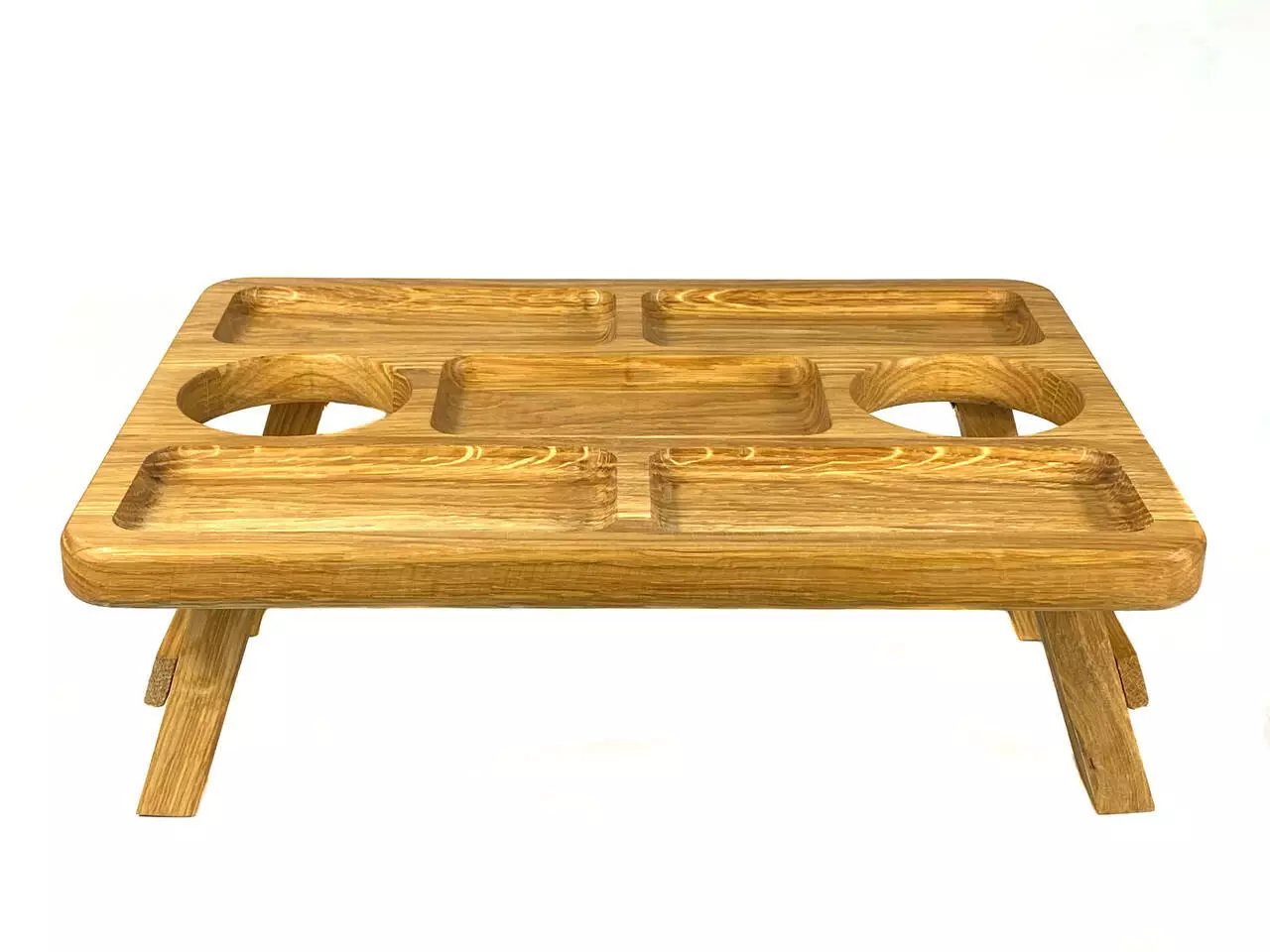 С двумя отверстиями для бокалов и пятью углублениями для закусок этот поднос идеально подходит для стильной сервировки вечеринок или интимных вечеров за бокалом вина. Размеры 38*28 и высота 14 см обладают оптимальными габаритами для застолья или отдыха в постели.