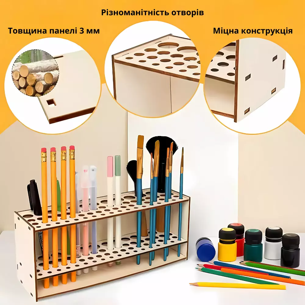 Компактные размеры (25х10х7см) и полированная поверхность придают изделию стильный и натуральный вид. Прочная конструкция обеспечивает надежное хранение до 67 кистей разного диаметра, а простота сборки делает его идеальным выбором для дома, офиса или студии.