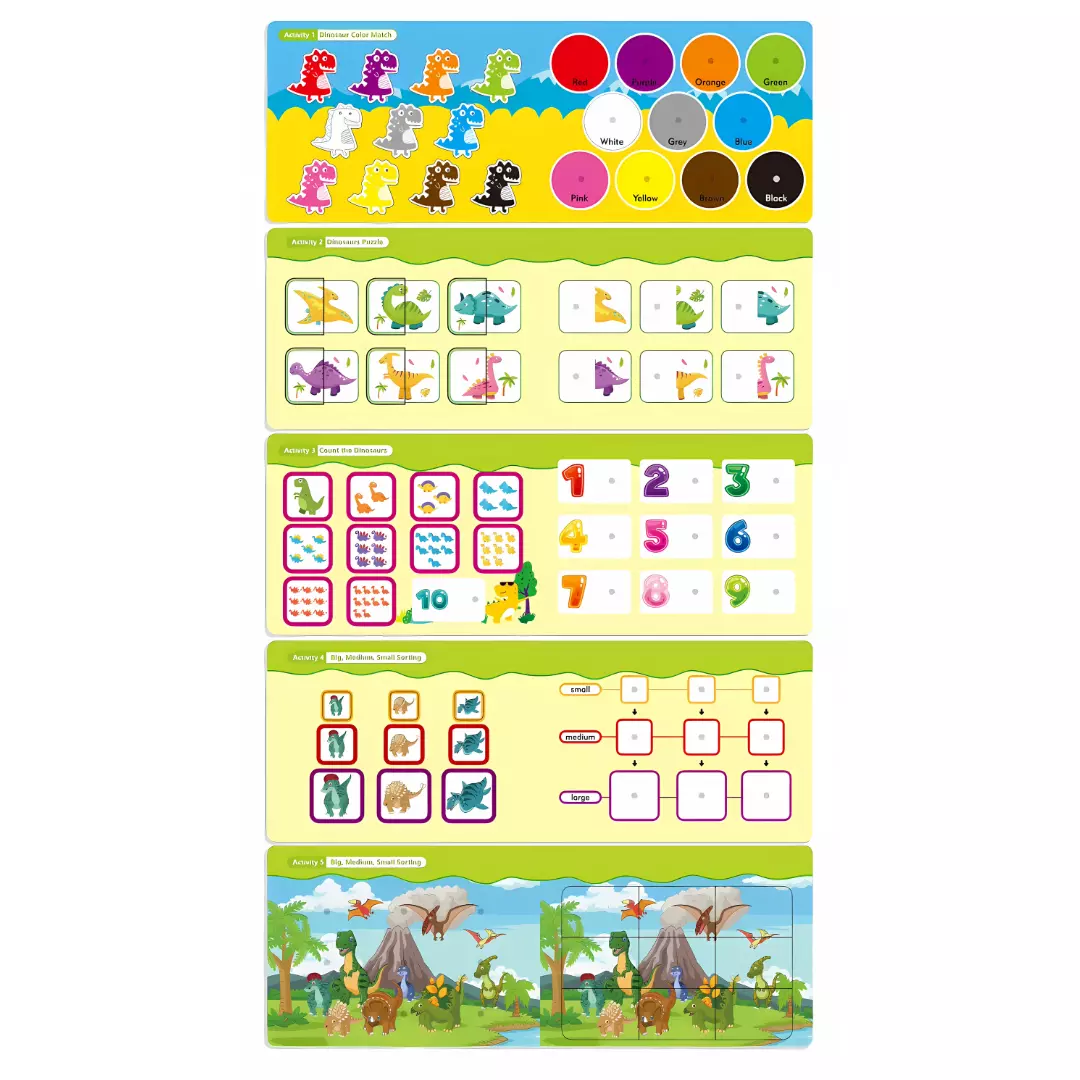 Книга Монтессори содержит 5 красочных страниц с заданиями, среди которых пазлы, сортировка и сюжетные задания с элементами на липучках.