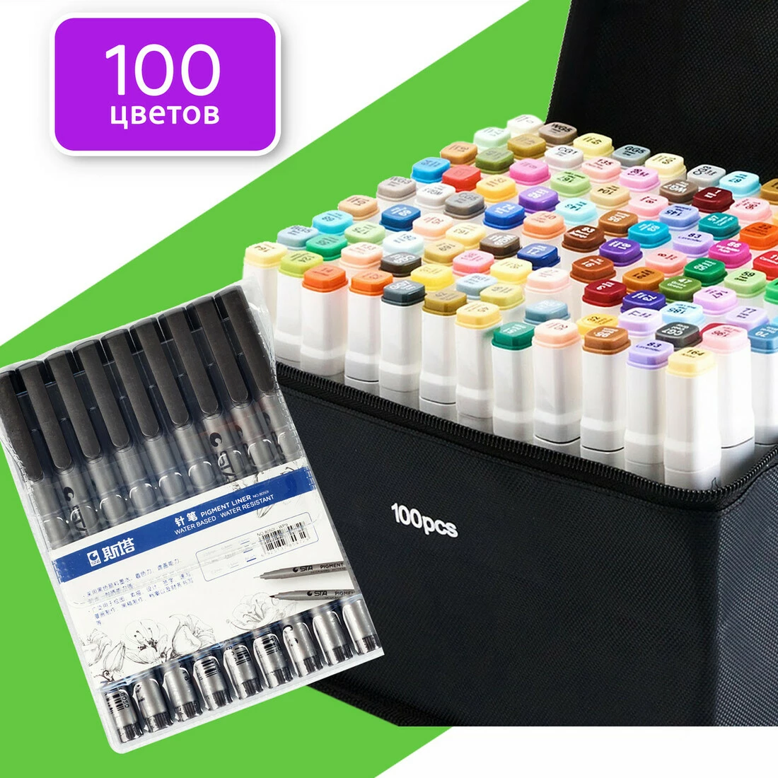 Двусторонние маркеры Touch 100 цветов и набор лайнеров 9 шт для рисования и скечтей, набор фломастеров