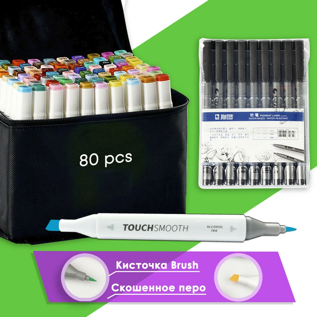 Вы покупаете Набор двусторонних маркеров Touch Smooth для скетчинга на спиртовой основе 80 штук с кисточкой и вместе с ними получаете набор качественных лайнеров 9 шт. разного диаметра от 0.05 мм до 0.8 мм и кисточки Brush.