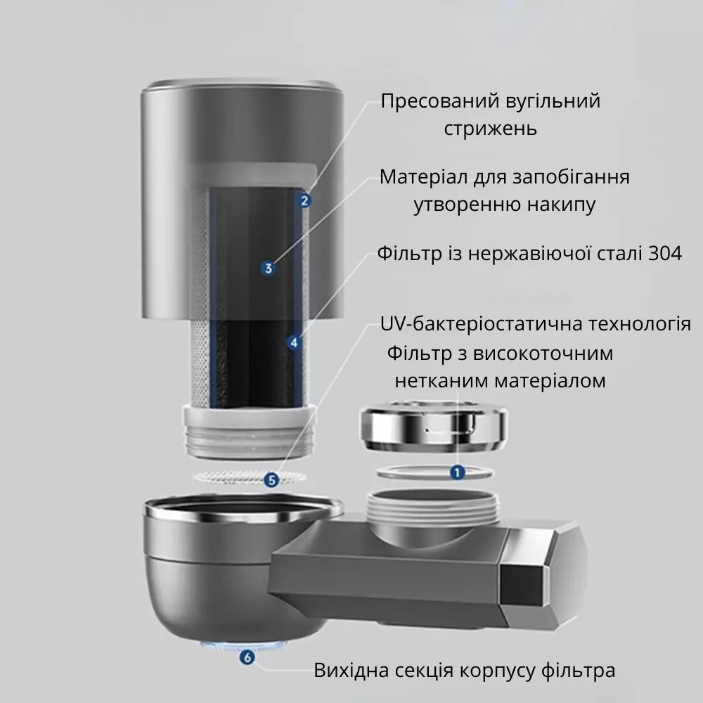 Эффективный и компактный фильтр-насадка предназначен для установки на кухонный или ванной кран, обеспечивая 6 уровней очистки воды. Подходит для фильтрации ржавчины, песка, осадка и хлора благодаря встроенному фильтру из нержавеющей стали и многоступенчатой системе. Конструкция фильтра разъёмная — удобно промывать и обслуживать. Цифровой дисплей (если предусмотрен) может отображать степень загрязнения и температуру воды. Имеется функция разделения потоков — можно переключаться между фильтрованной и обычной водой. Благодаря универсальным адаптерам подходит для 99% кранов.
