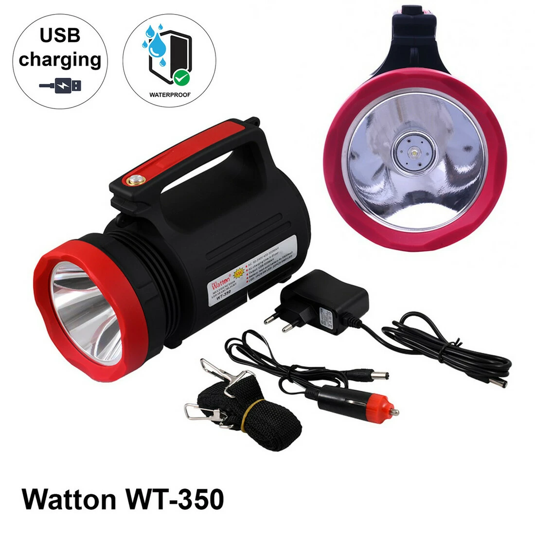 • Комплектация: фонарь, автомобильный и обычный зарядный кабель 220 Вт.
