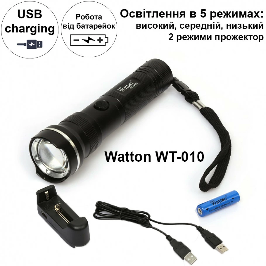 Фонарик мощный аккумуляторный широкоугольный Watton WT-010 Cree T6 ручной карманный фонарь