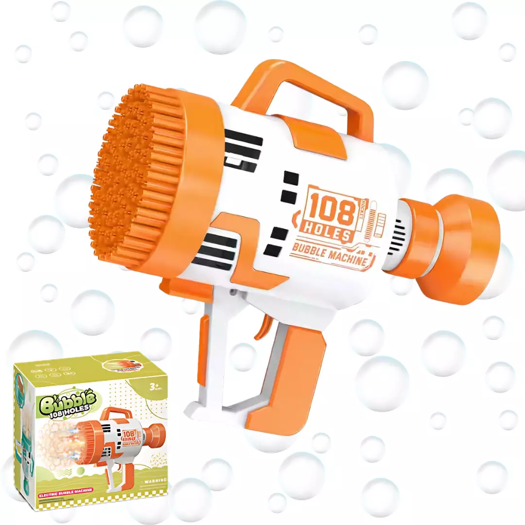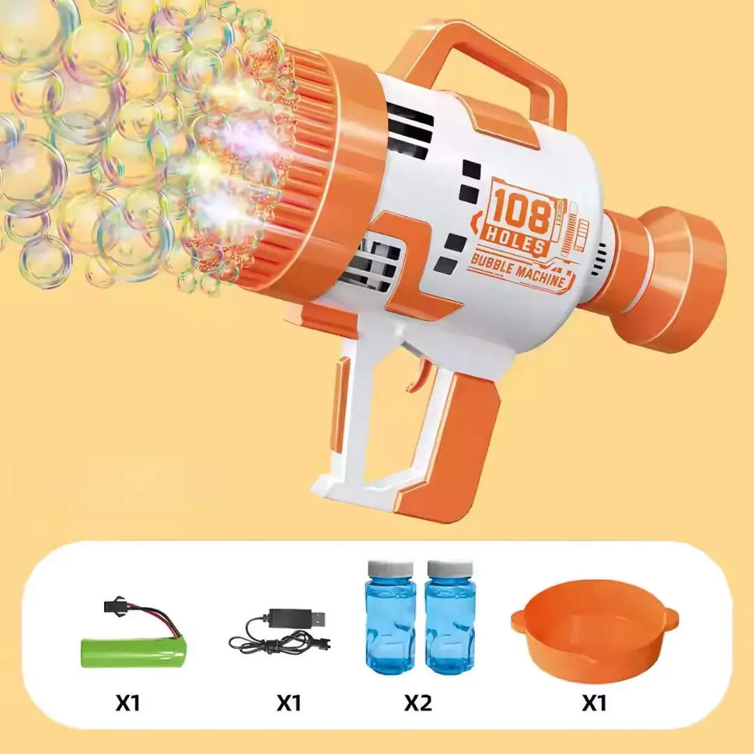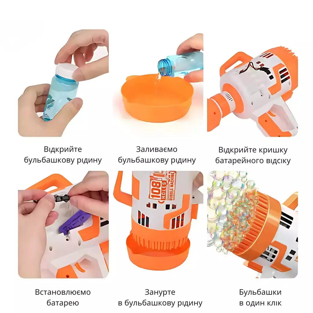 Создайте атмосферу радости с автоматическим пузырьковым пистолетом! Игрушка имеет 108 отверстий для выпуска сотни переливающихся пузырей за секунды. LED-подсветка и музыкальное сопровождение делают игру еще более увлекательной, особенно в вечернее время.