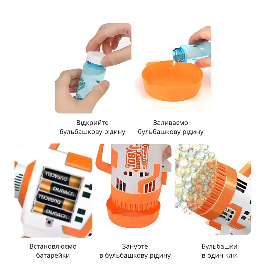 Этот пузырьковый бластер станет отличным развлечением для детей от 3 лет и старше. Легкий и компактный, он идеально подходит для игр на улице, вечеринок и праздников. Прочная конструкция гарантирует долговечность, а простота в использовании делает его любимой игрушкой для детей.