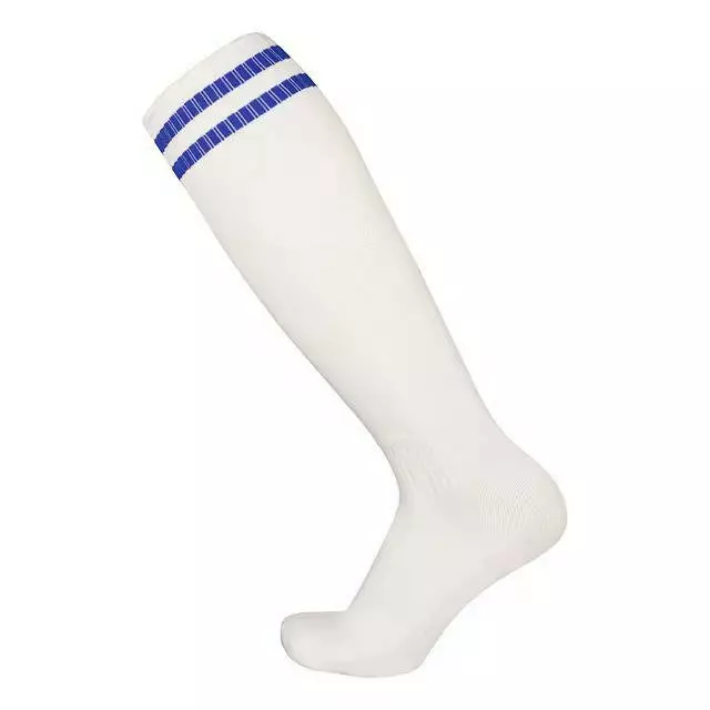 Гетры футбольные с полотенечной тканью на подошве белые с синими пололсками CZST-314,размер S