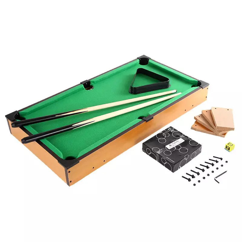 Комплектация: бильярдный стол, 2 кия, 16 шариков диаметром 2.5 см, треугольник, мелок.