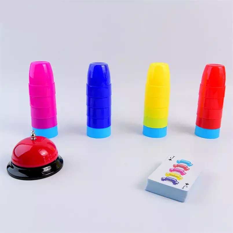 Комплектация: 54 карты с заданиями, 20 колпачков пяти цветов, звонок