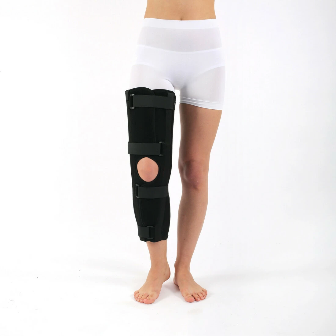 Бандаж изготовлен из губчатой ткани с полотенцем внутри. Обеспечивает иммобилизацию при разгибании колена. Имеет съемные алюминиевые опоры, которые обеспечивают заднюю, среднюю и боковую стабилизацию. Используется при операциях на колене и после травм. Размеры стандартные и регулируются благодаря липучке. Длина бандажа 55 см.