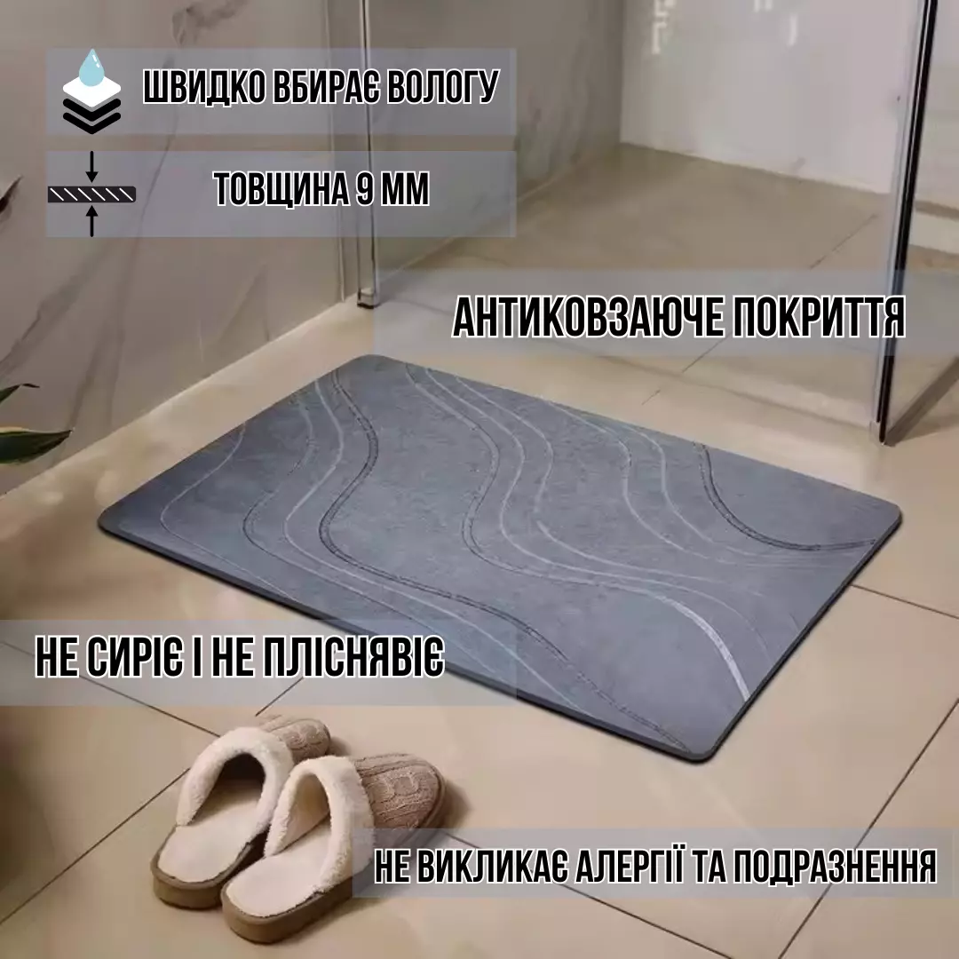 Однотонный тёмно-серый цвет с изысканным волнистым узором подчеркнёт современный стиль вашего интерьера. Коврик не только моментально впитывает влагу (всего за 30 секунд), но и предотвращает её распространение, сохраняя полы сухими и чистыми. Идеально подходит для ванной комнаты, душа, кухни, прихожей и зоны кормления домашних животных.