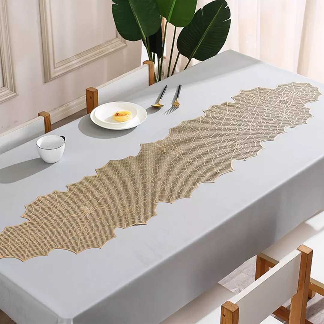 Золотистый цвет и изысканный принт в виде паутины придают сервировке оригинальность и праздничное настроение. Идеален как для повседневного использования, так и для тематических приёмов и торжеств.