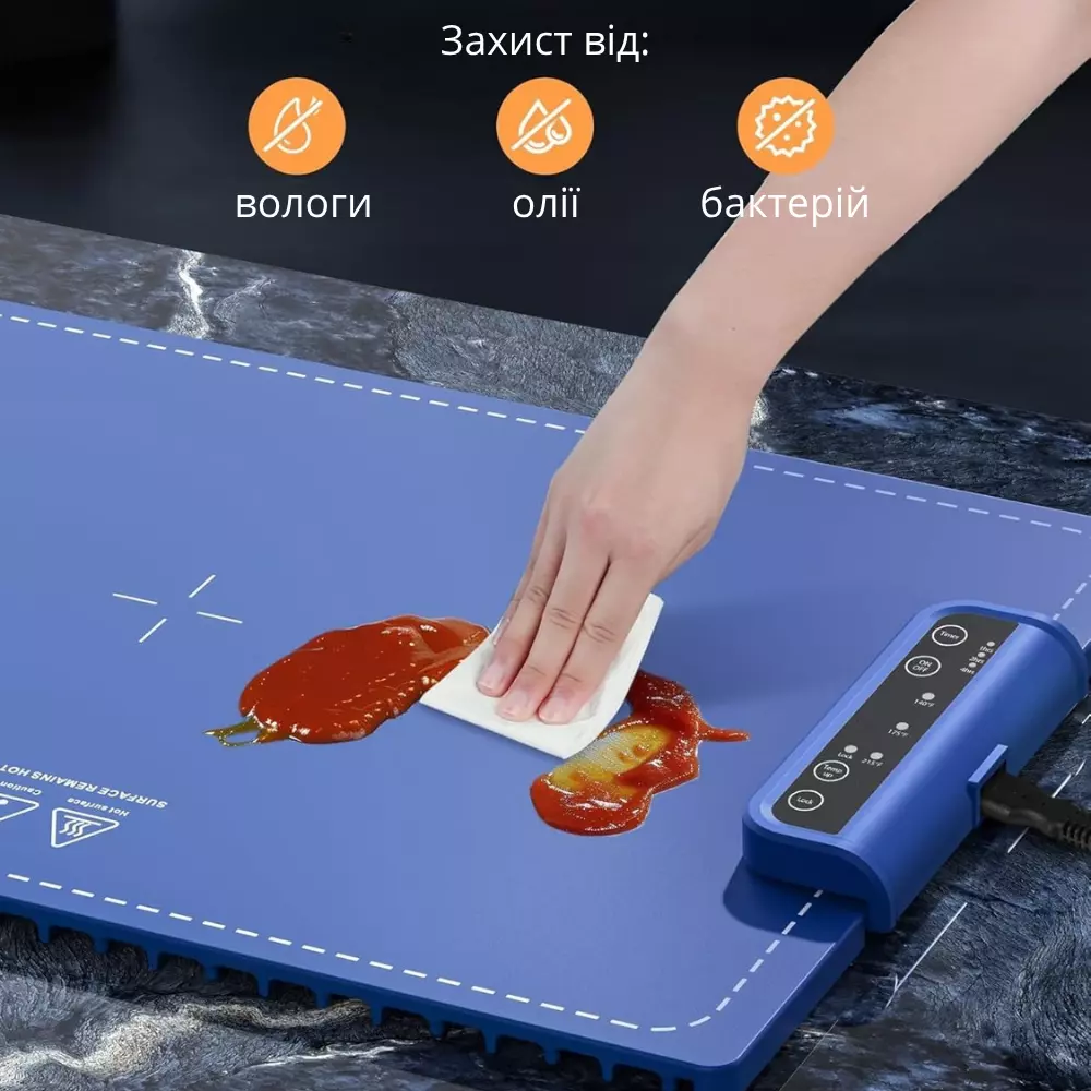 Коврик изготовлен из пищевого силикона, устойчивого к высоким температурам и безопасного для ежедневного использования. Он антибактериальный и легко очищается — не впитывает жир, масло и остатки пищи. Поверхность достаточно протереть влажной тканью, чтобы вернуть чистоту. Подходит также для разморозки продуктов, подогрева молока, теста и других задач, включая ферментацию.