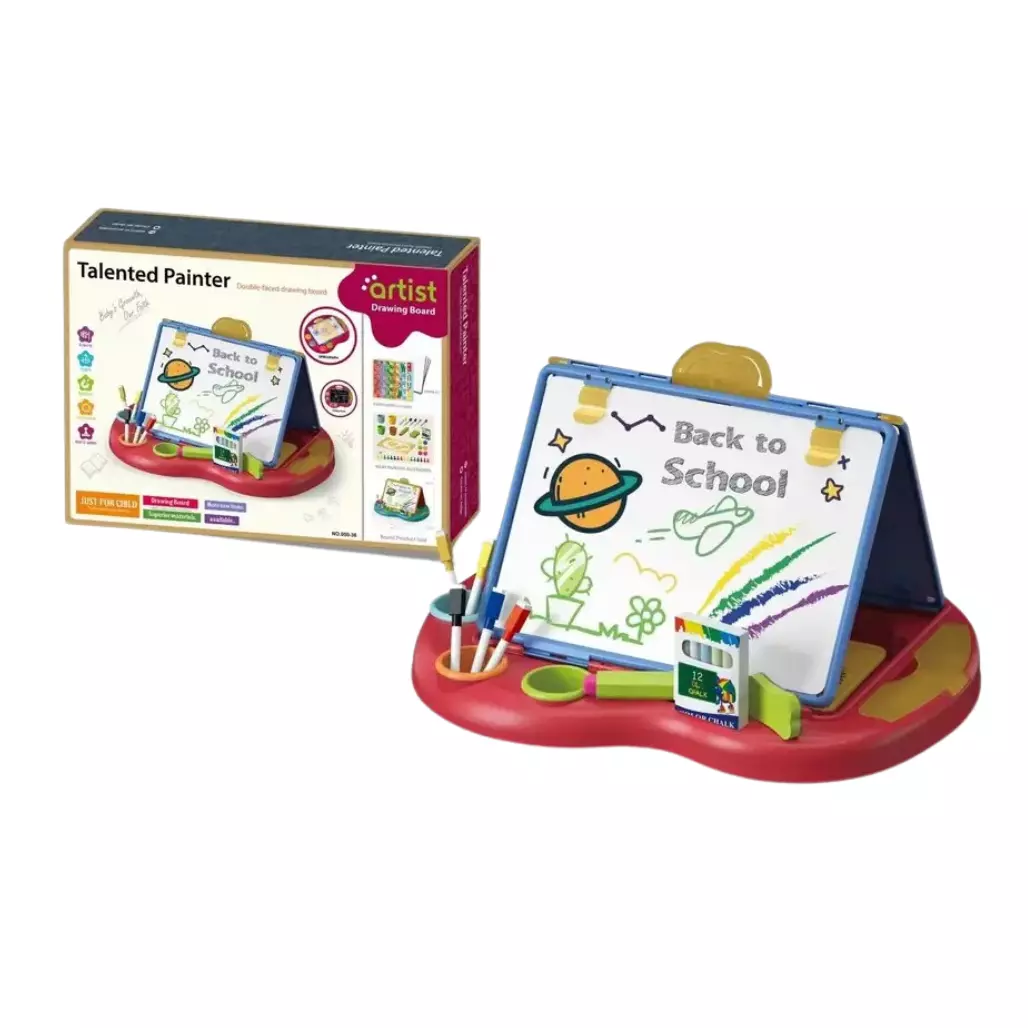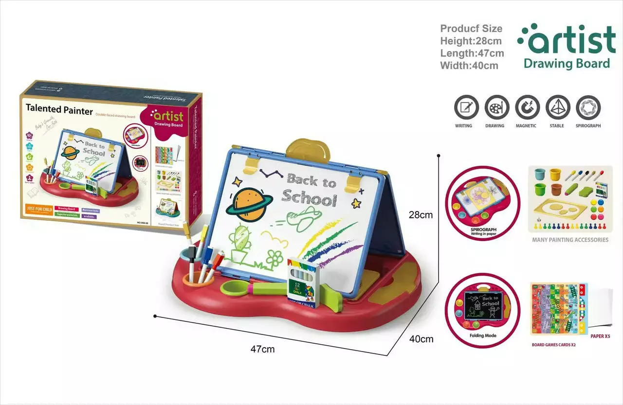 Доска имеет режим складывания, что облегчает её хранение и транспортировку. В комплекте поставляются пять листов бумаги и множество аксессуаров для рисования, которые помогут детям развивать свои навыки. Стабильная конструкция на основе пластика гарантирует долговечность, экологичность и безопасность использования.
