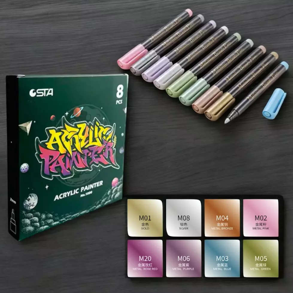 Маркеры акриловые STA для рисования, премиум качество, набор 8 Metallic цветов