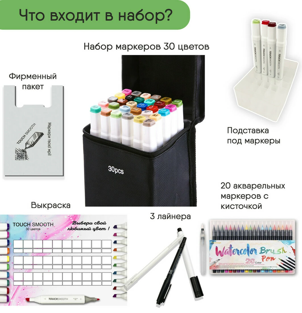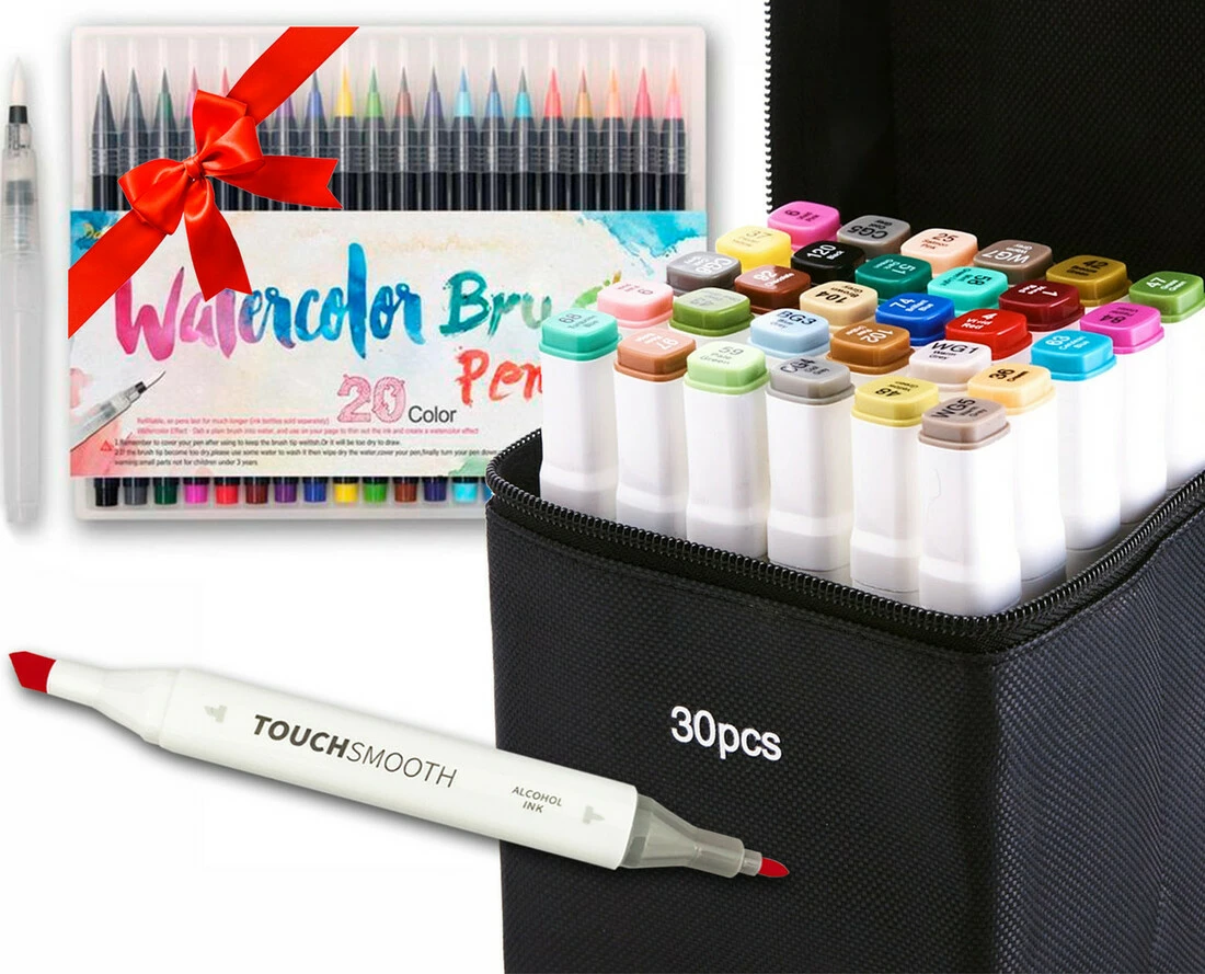 Вы покупаете Набор двусторонних маркеров Touch Smooth для скетчинга на спиртовой основе 30 шт и вместе с ними получаете Набор акварельных маркеров Water Color Brush маркер - кисточка 20 цветов