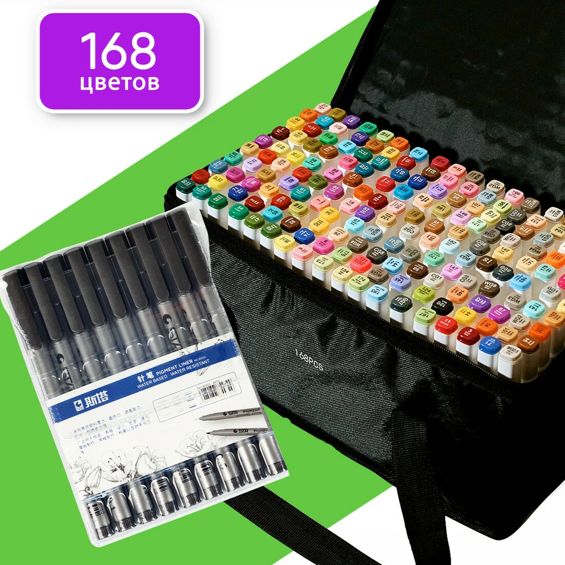 Маркеры двусторонние Touch 168 цветов и набор лайнеров 9 шт для эскизов и скетчей, набор фломастеров