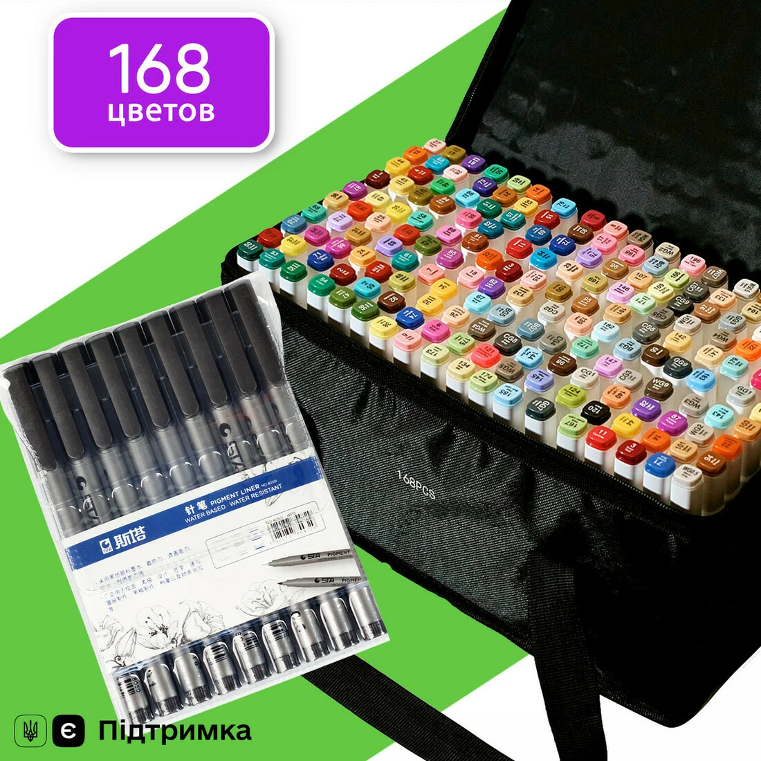 Вы покупаете Набор двусторонних маркеров Touch Smooth для скетчинга на спиртовой основе 168 шт и вместе с ними получаете набор качественных лайнеров 9 шт. разного диаметра от 0.05 мм до 0.8 мм и кисточки Brush.