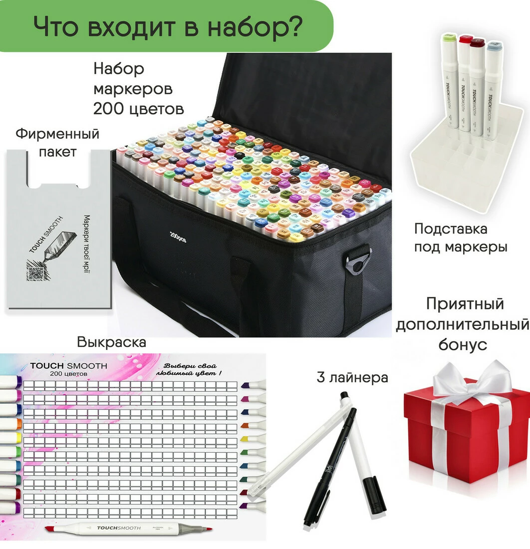 Вы покупаете Набор двусторонних маркеров Touch Smooth для скетчинга на спиртовой основе 200 шт и вместе с ними получаете набор качественных лайнеров 24 цвета диаметром 0.4 мм