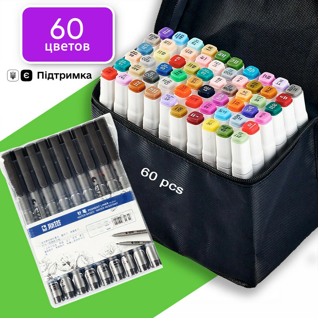 Вы покупаете Набор двусторонних маркеров Touch Smooth для скетчинга на спиртовой основе 60 шт и вместе с ними получаете набор качественных лайнеров 9 шт. разного диаметра от 0.05 мм до 0.8 мм и кисточки Brush.