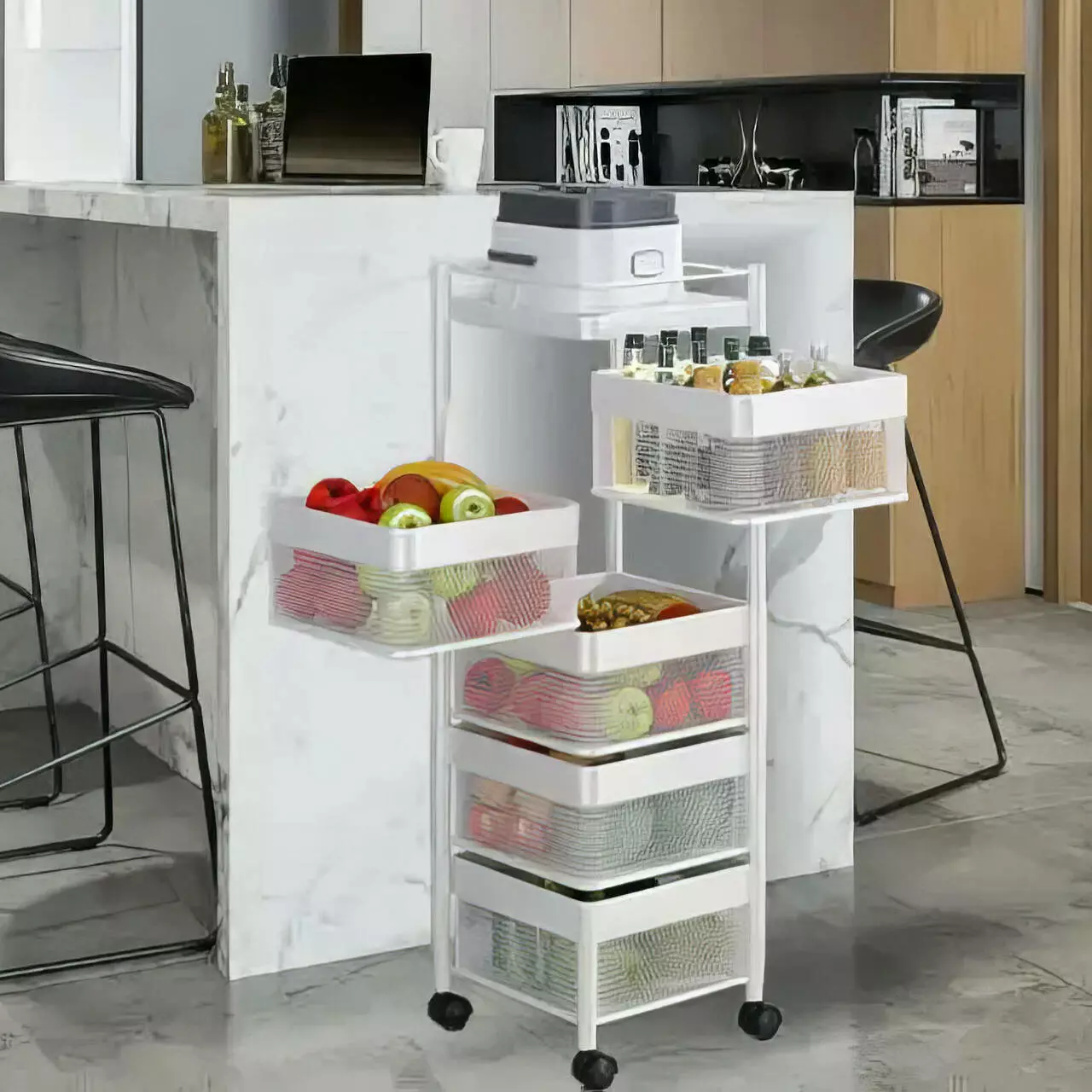 Благодаря пяти глубоким полкам, стеллаж обеспечивает достаточно места для хранения посуды, продуктов или аксессуаров. Колесики с легким ходом обеспечивают мобильность конструкции, позволяя легко перемещать её из одной комнаты в другую.