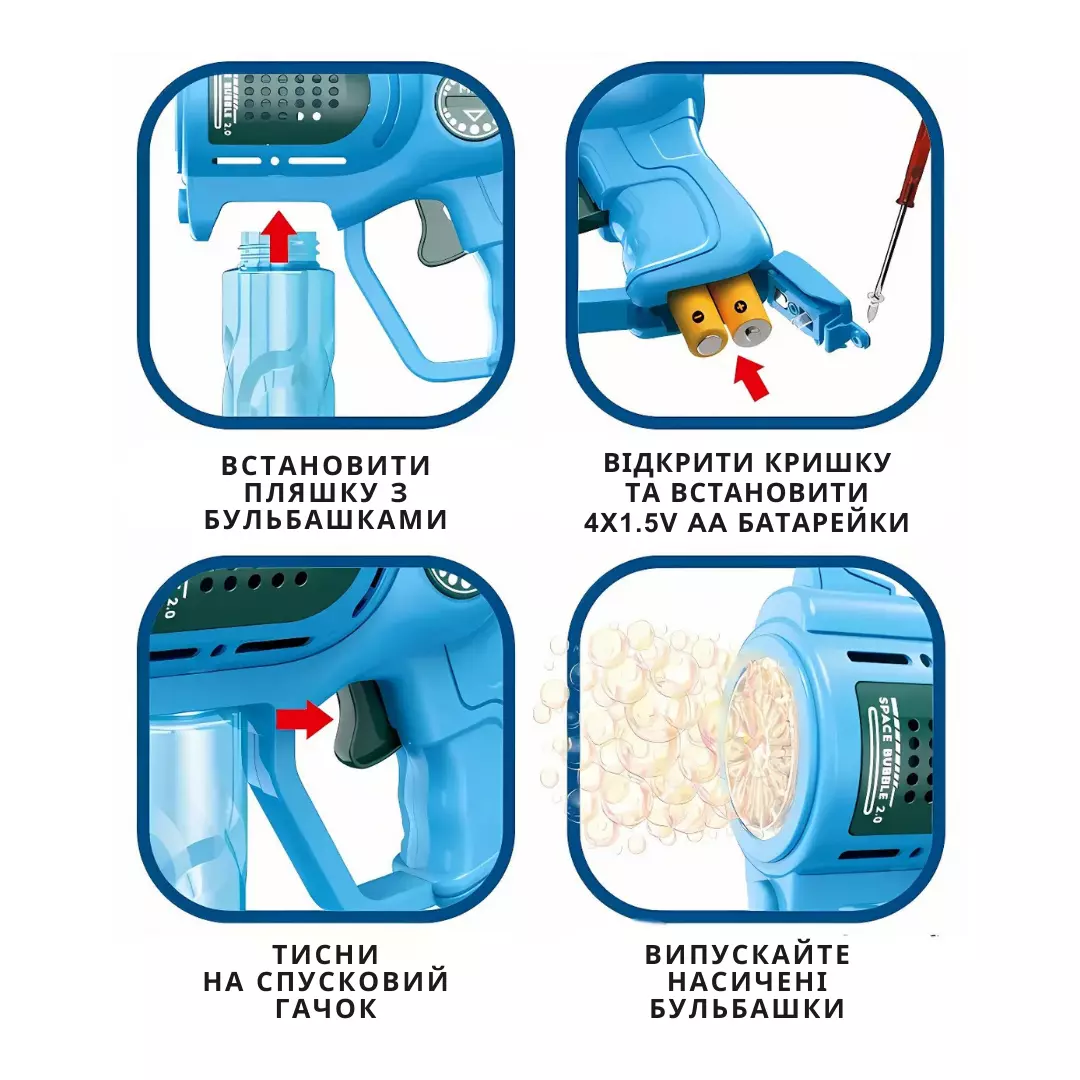 Игрушка работает на 4 батарейках типа AA (не включены в комплект), что делает ее удобной в использовании. Просто налейте раствор в специальную емкость, нажмите кнопку - и пистолет начнет создавать захватывающее облако пузырей. Он идеально подходит для детских праздников, вечеринок и веселых прогулок на свежем воздухе.