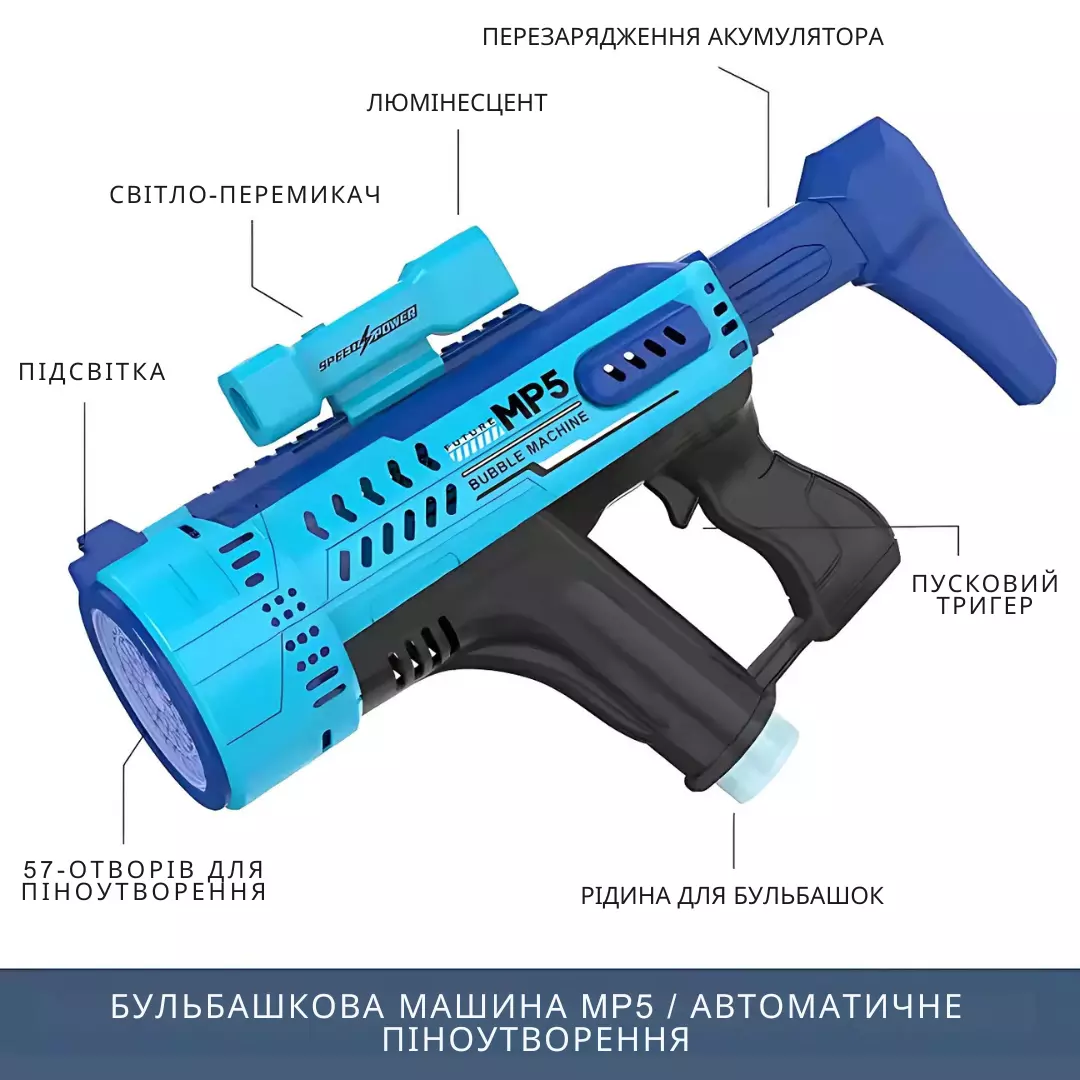 Комплектация: пистолет для мыльных пузырей, световой мультипликатор, кабель для зарядки, резервуар для жидкости