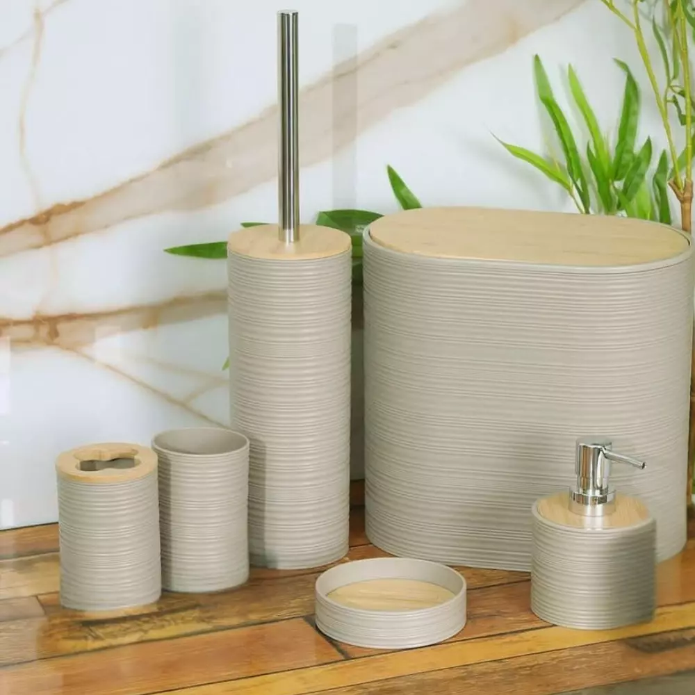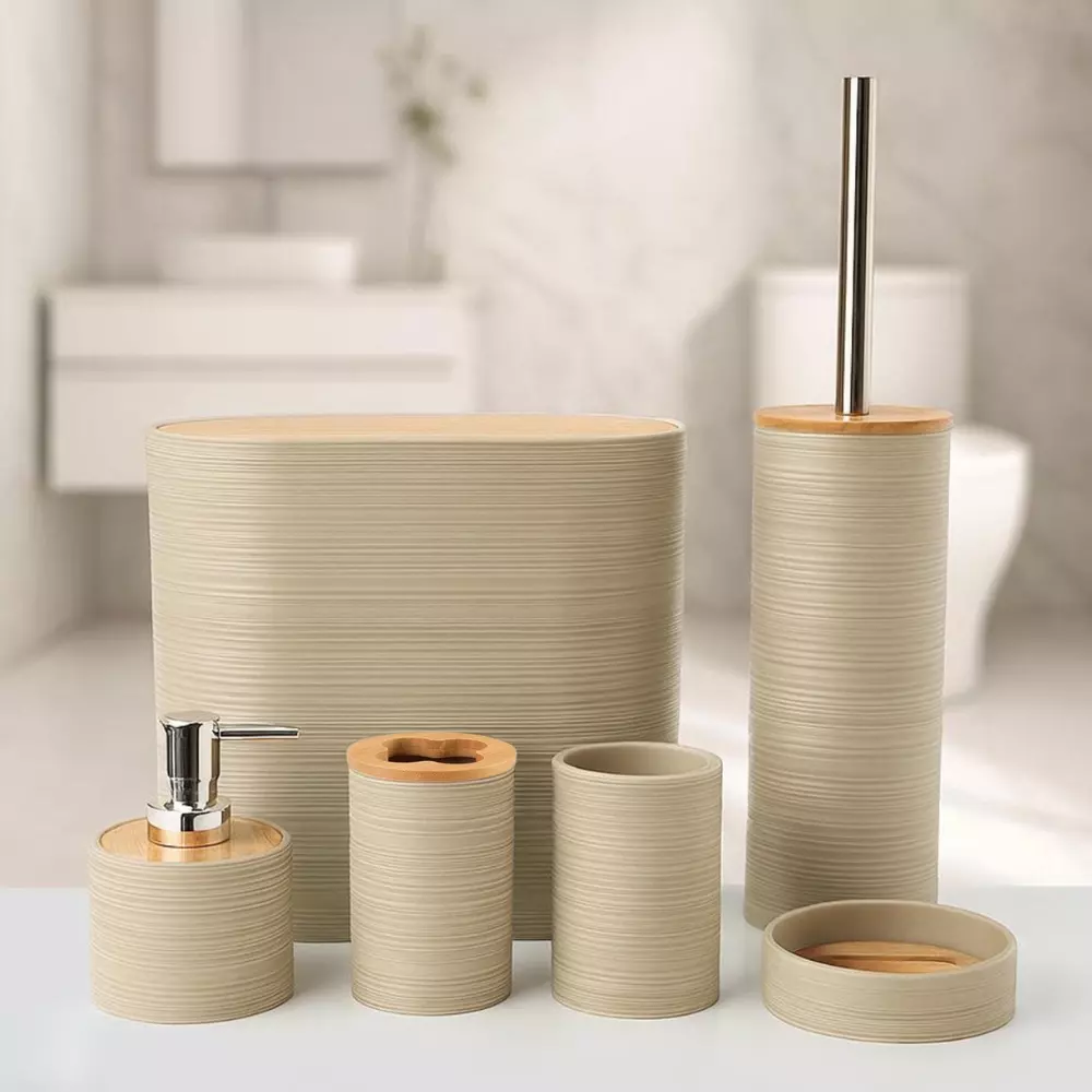 Набор аксессуаров 6в1 для ванной комнаты и душа, урна,дозатор для мыла, мыльница, стаканы,ёршик бежевый