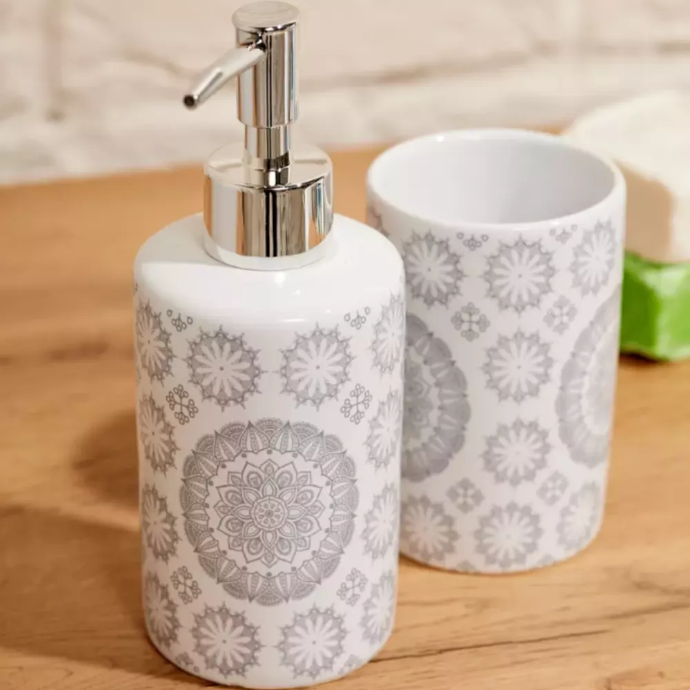 Стакан и дозатор для мыла из керамики, прочные и стильные.