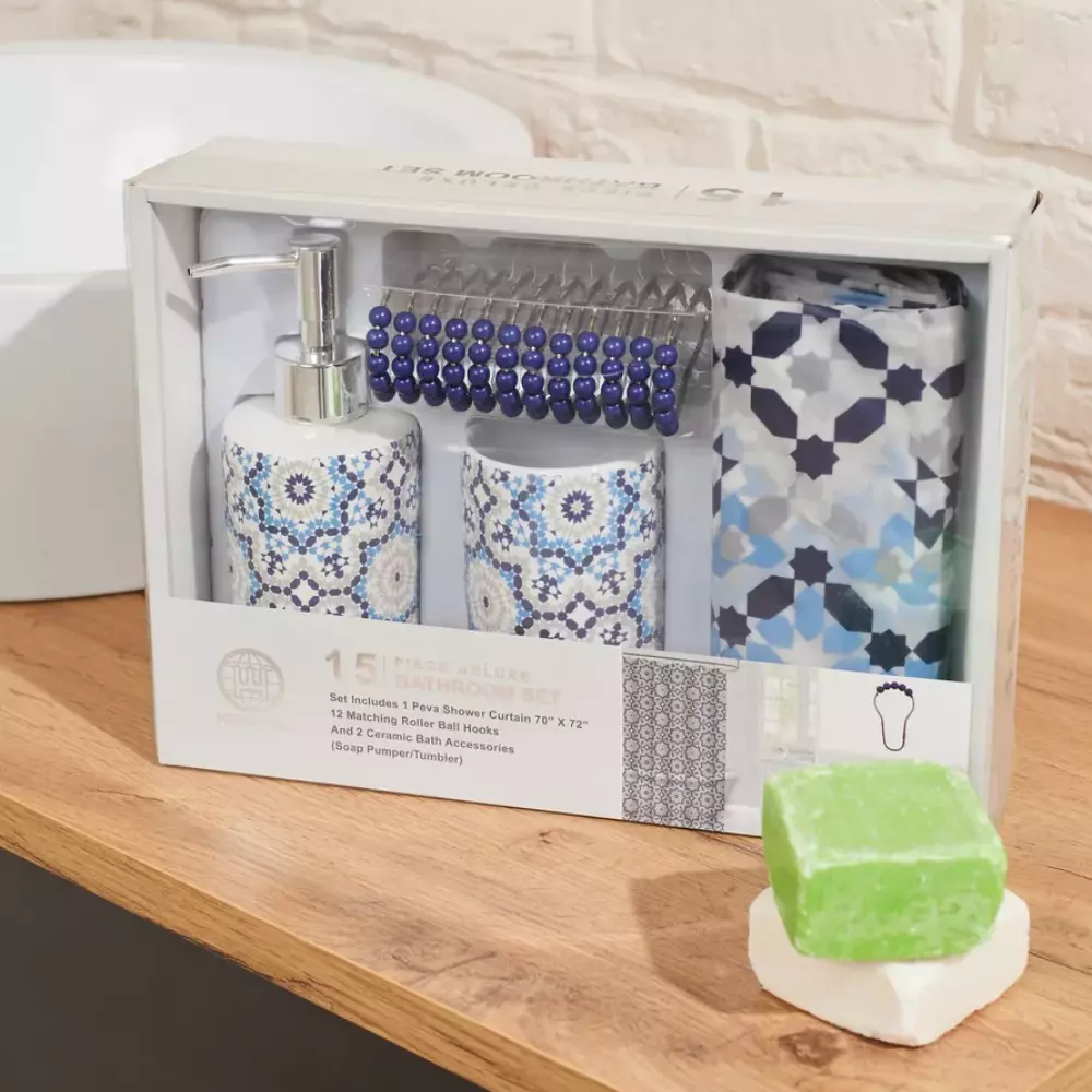 Набор аксессуаров для ванны и душа, комплект принадлежностей: штора,дозатор для мыла,стакан для щеток