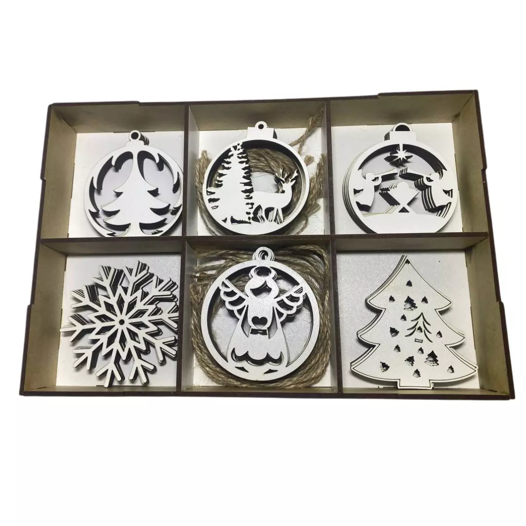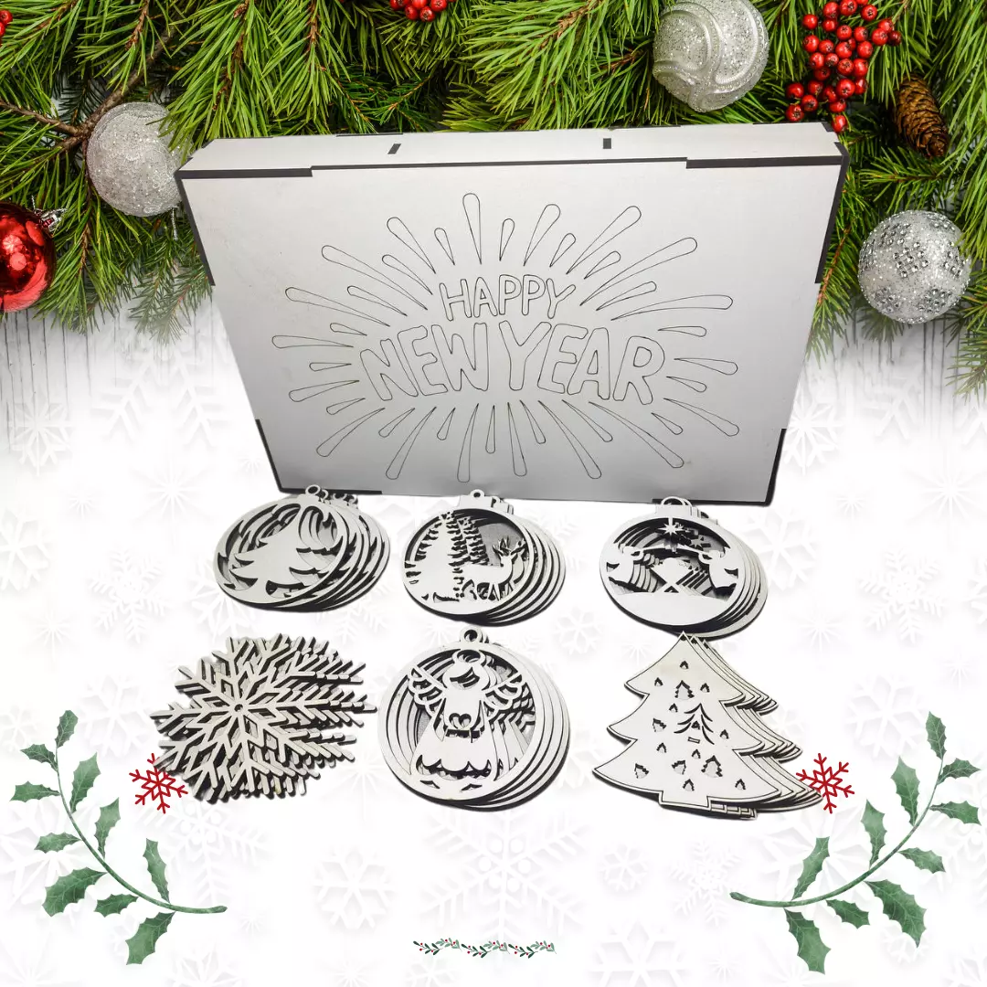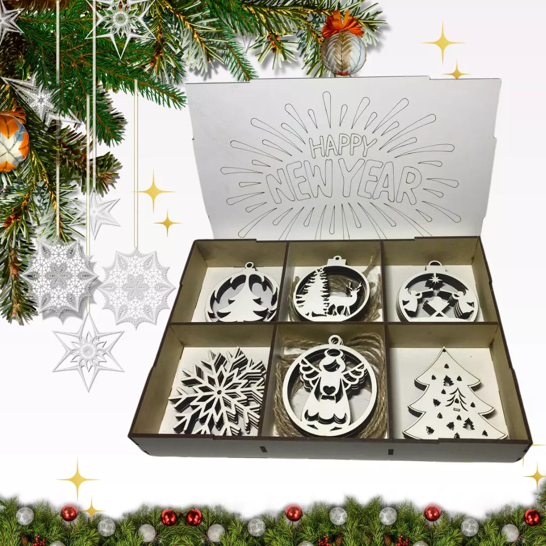 Набор деревянных игрушек на ёлку "Happy New Year" в кробке 30 шт,шесть видов украшений,размер 27х18х4,5 см