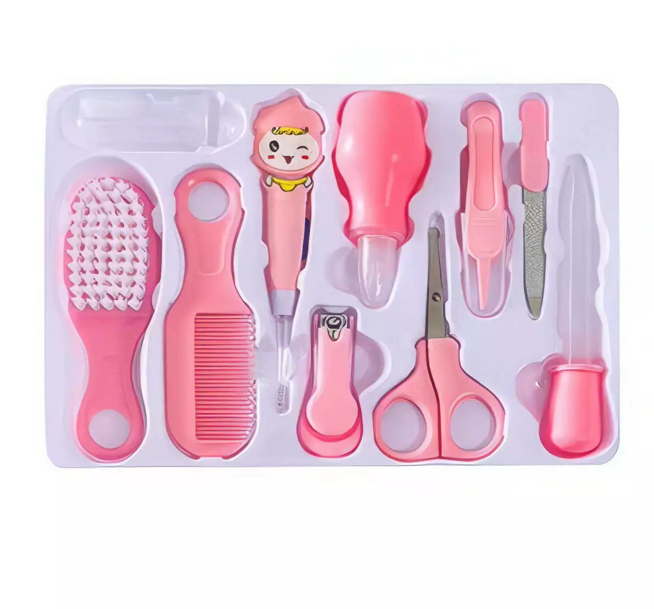 - Состав набора: Полировальные пилочки|Щетка для волос|Прорезыватель|Расческа|Дозатор лекарств|Ножнички|Кусачки для ногтей|Назальный аспиратор|Зубная щетка|Пинцет