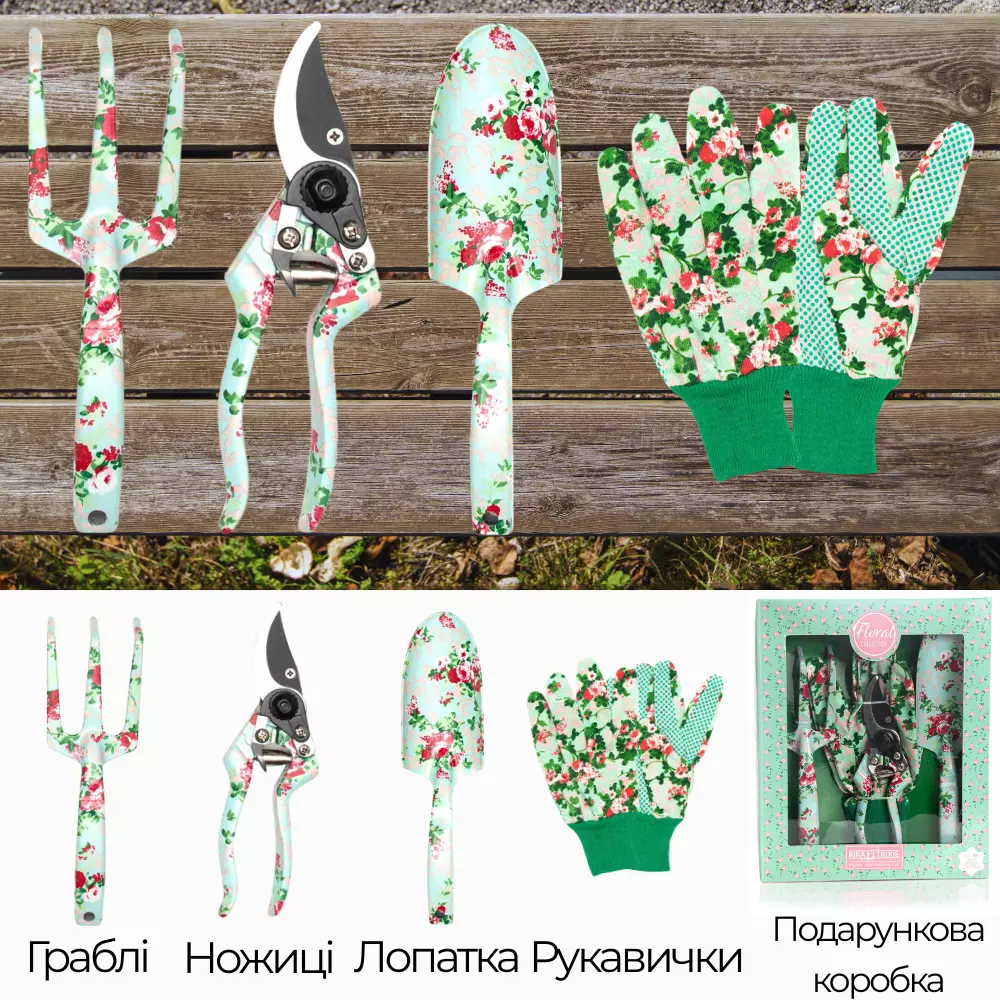 Комплектация: садовые ножницы, лопатка, ручные грабли, садовые перчатки