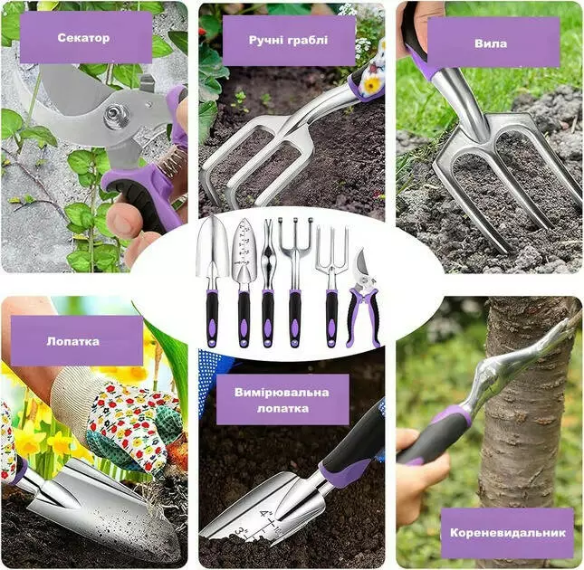 Полный набор – 6 садовых инструментов и множество полезных аксессуаров.