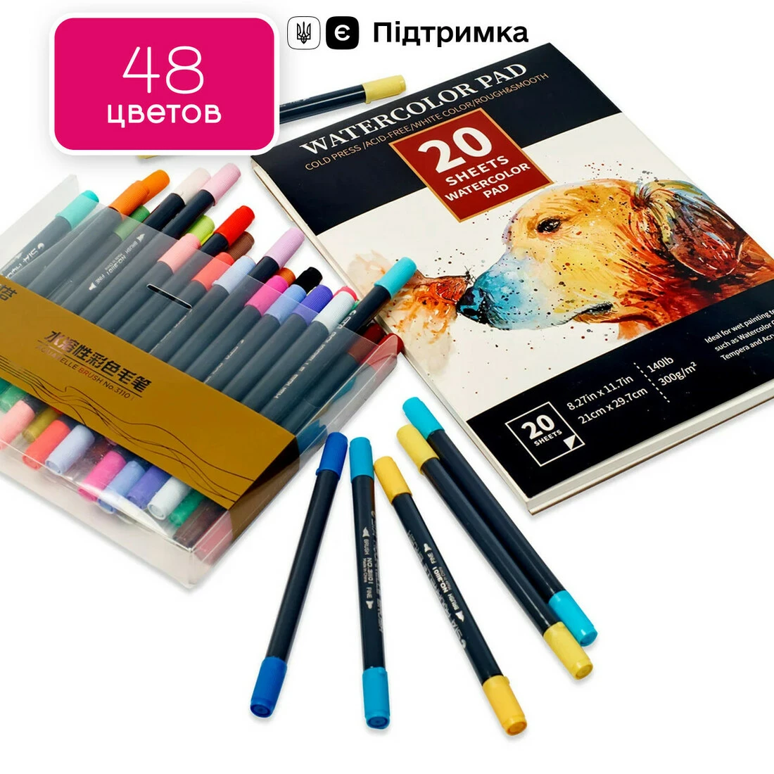 Набор для скетчей, акварельные двухсторонние маркеры для рисования 48 шт + акварельная бумага 20 листов