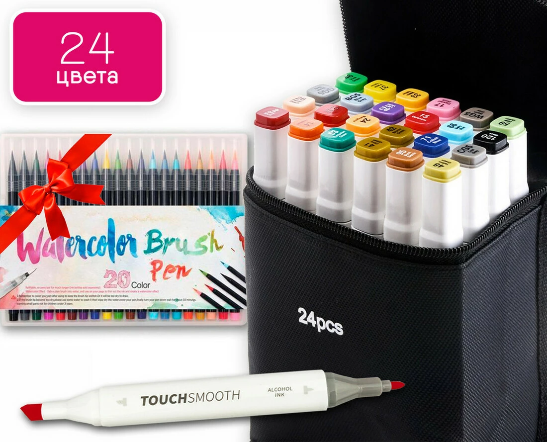 Вы покупаете Набор двусторонних маркеров Touch Smooth для скетчинга на спиртовой основе 24 шт и вместе с ними получаете Набор акварельных маркеров Water Color Brush маркер - кисточка 20 цветов
