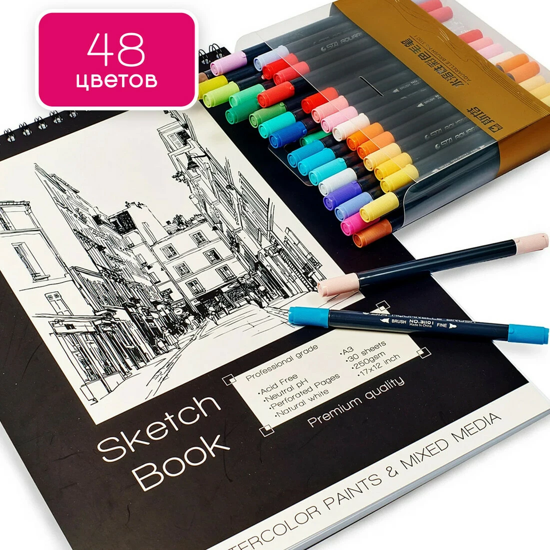 Набор для скетчей, Скетчбук для рисования А3 на 30 листов + большой набор двухсторонних маркеров для скетчинга