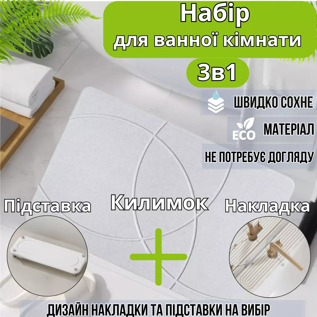 Комплект изготовлен из диатомита – натурального минерала, известного своей высокой впитывающей способностью. Этот материал быстро впитывает влагу, не плесневеет, не требует сложного ухода и является экологически чистым.