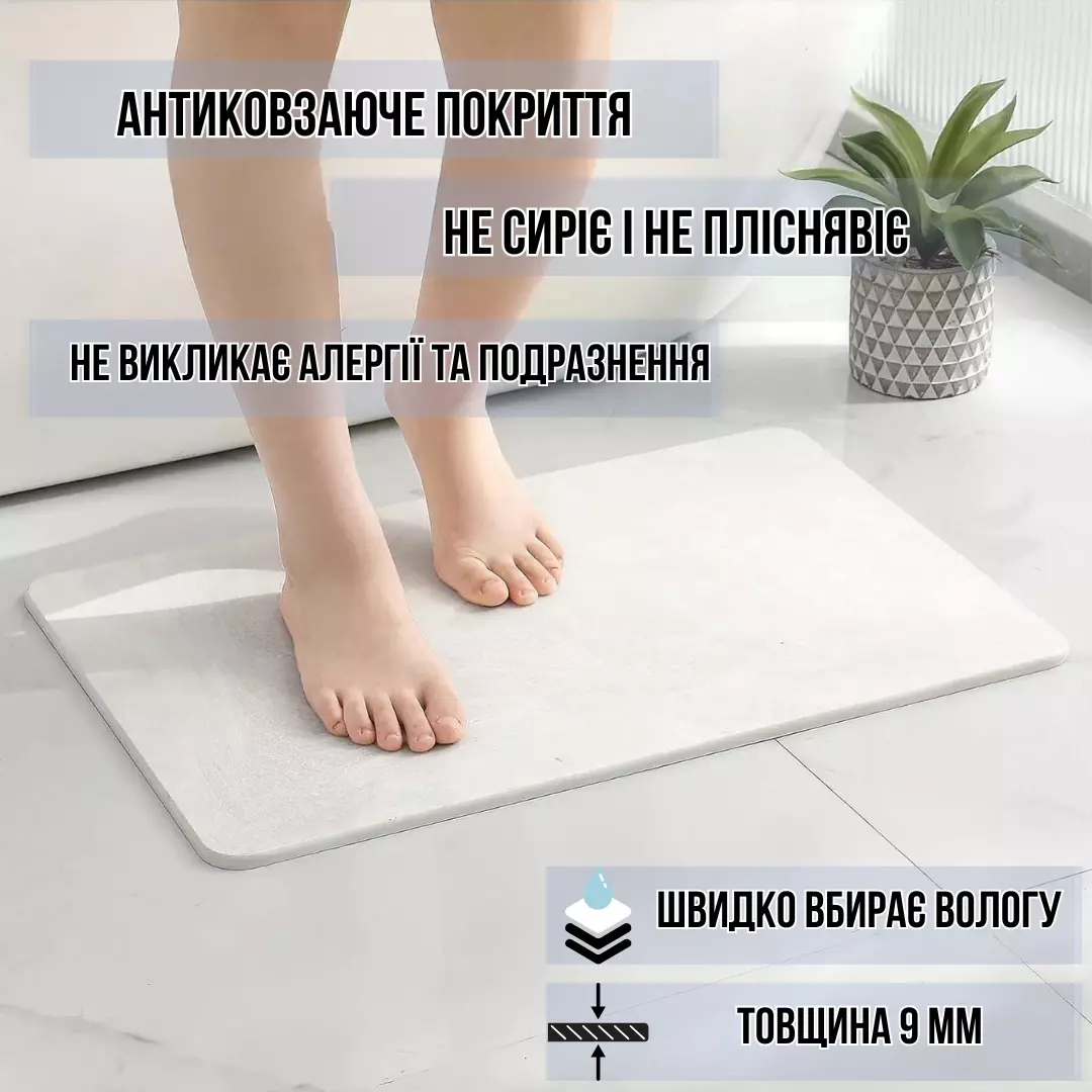Коврик для ног (60×39 см, толщина 9 мм) – быстро впитывает влагу и оставляет поверхность сухой.