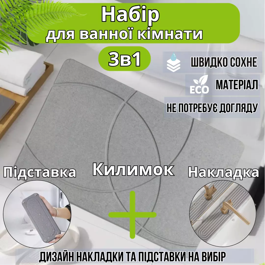 • Коврик-накладка для раковины (60×10 см) – удобная площадка для хранения мыла и аксессуаров.