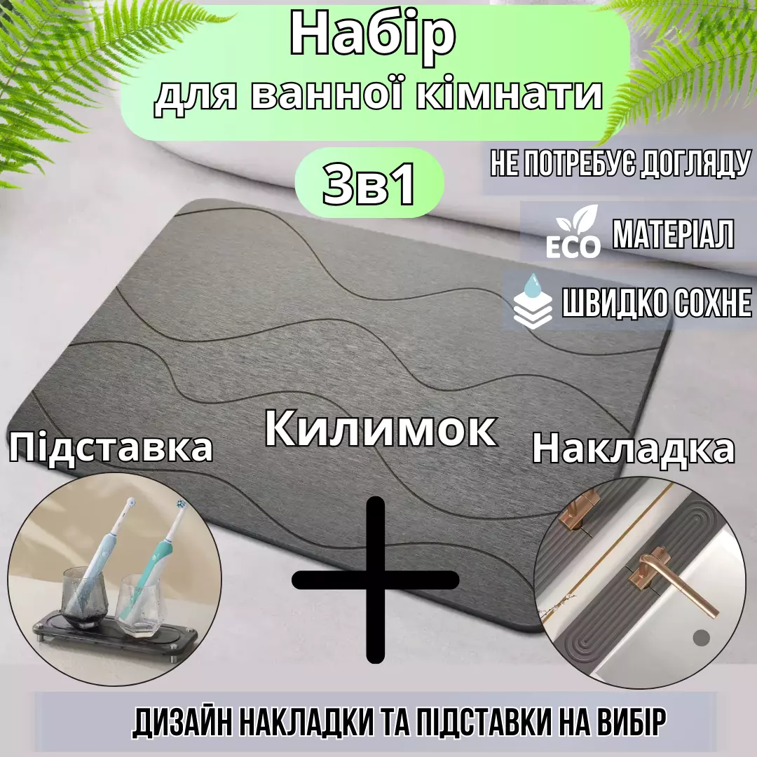 Комплект изготовлен из диатомита — природного минерала, состоящего из мельчайших окаменелых водорослей. Этот материал известен своей высокой влагопоглощающей способностью: он мгновенно впитывает воду и быстро высыхает, предотвращая появление плесени и неприятных запахов. Диатомит безопасен для здоровья, долговечен и прост в уходе, что делает его отличным выбором для ванной комнаты.