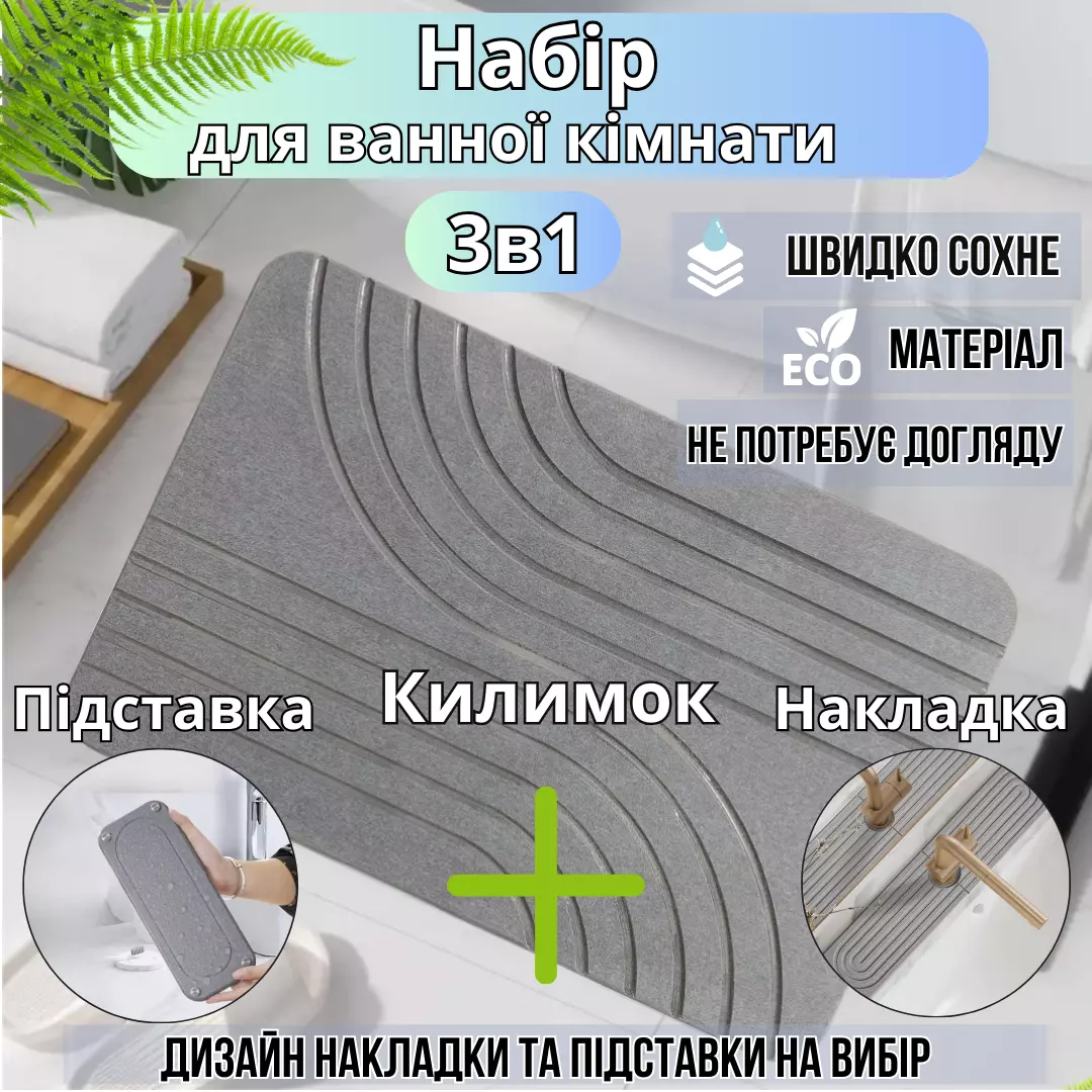 Комплект изготовлен из диатомита – натурального минерала с пористой структурой, который отлично впитывает влагу и моментально высыхает. Этот материал предотвращает развитие плесени, не требует особого ухода и является экологически чистым, что делает его безопасным для здоровья и окружающей среды.