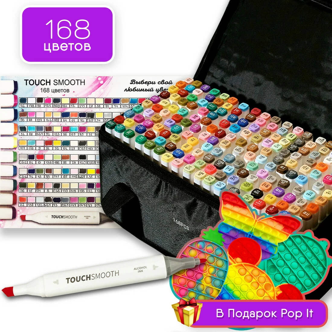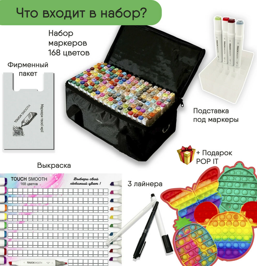 Набор двусторонних маркеров Touch Smooth для рисования и скетчинга 168 шт + ПОП ИТ